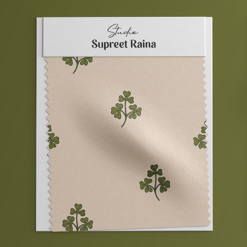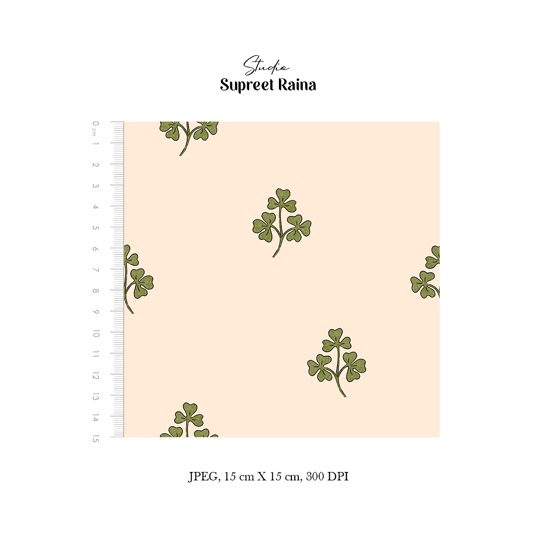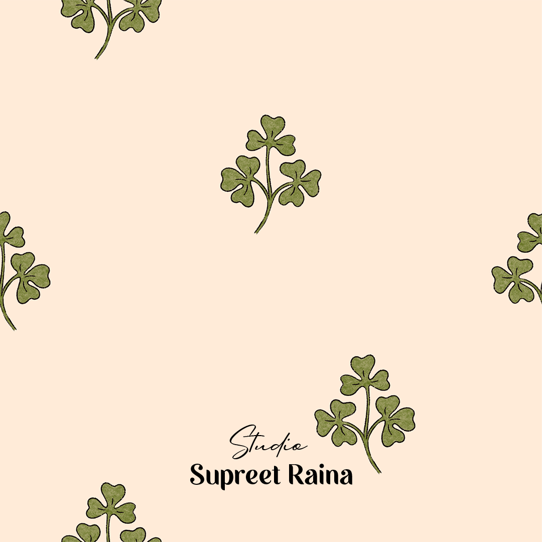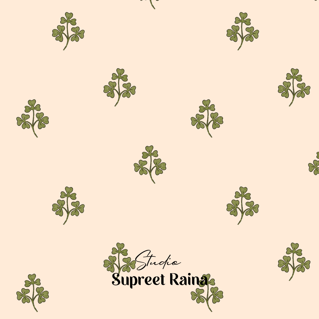 A minimal clover-inspired seamless pattern featuring delicate hand-drawn green leaves scattered across a warm neutral background. This soft botanical repeat feels calm, nostalgic, and subtly symbolic — perfect for timeless surface design applications.