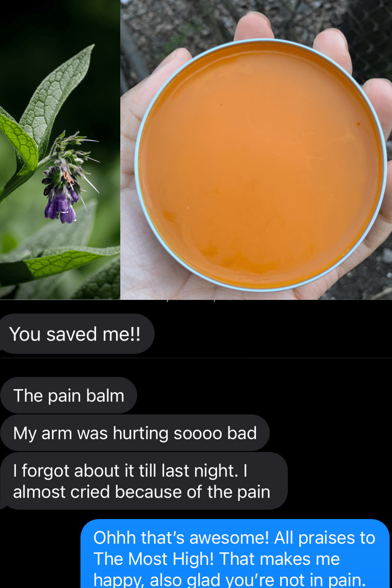 This pain salve was made with organic Herbs comfrey root, turmeric root and cayenne. All infused in grapeseed oil. It was carefully formulated and created to help bring relieve and comfort to those experiencing pain and discomfort.
