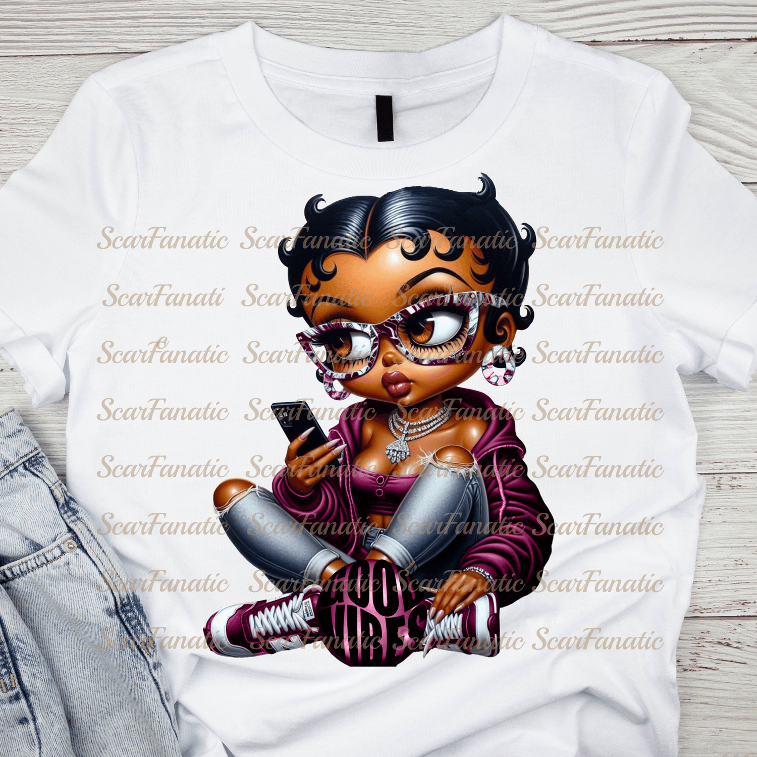 Good Vibes Black Betty Boop in Rose Pink/Light Purple hoodie, ripped jeans, sneakers, marble cat eye glasses, Sublimation, PNG, DTF, 300DPI, high resolution