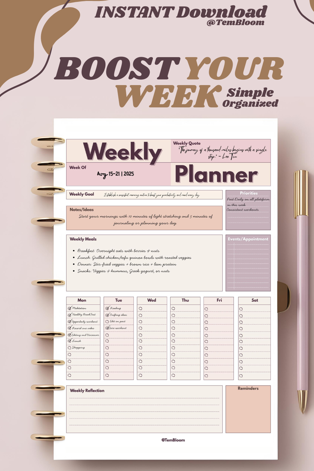 Stay organized, productive, and motivated all week long with this beautifully designed Weekly Planner. Perfect for personal use, business planning, or academic scheduling, it helps you set clear goals, track habits, and plan meals—all in one place.
