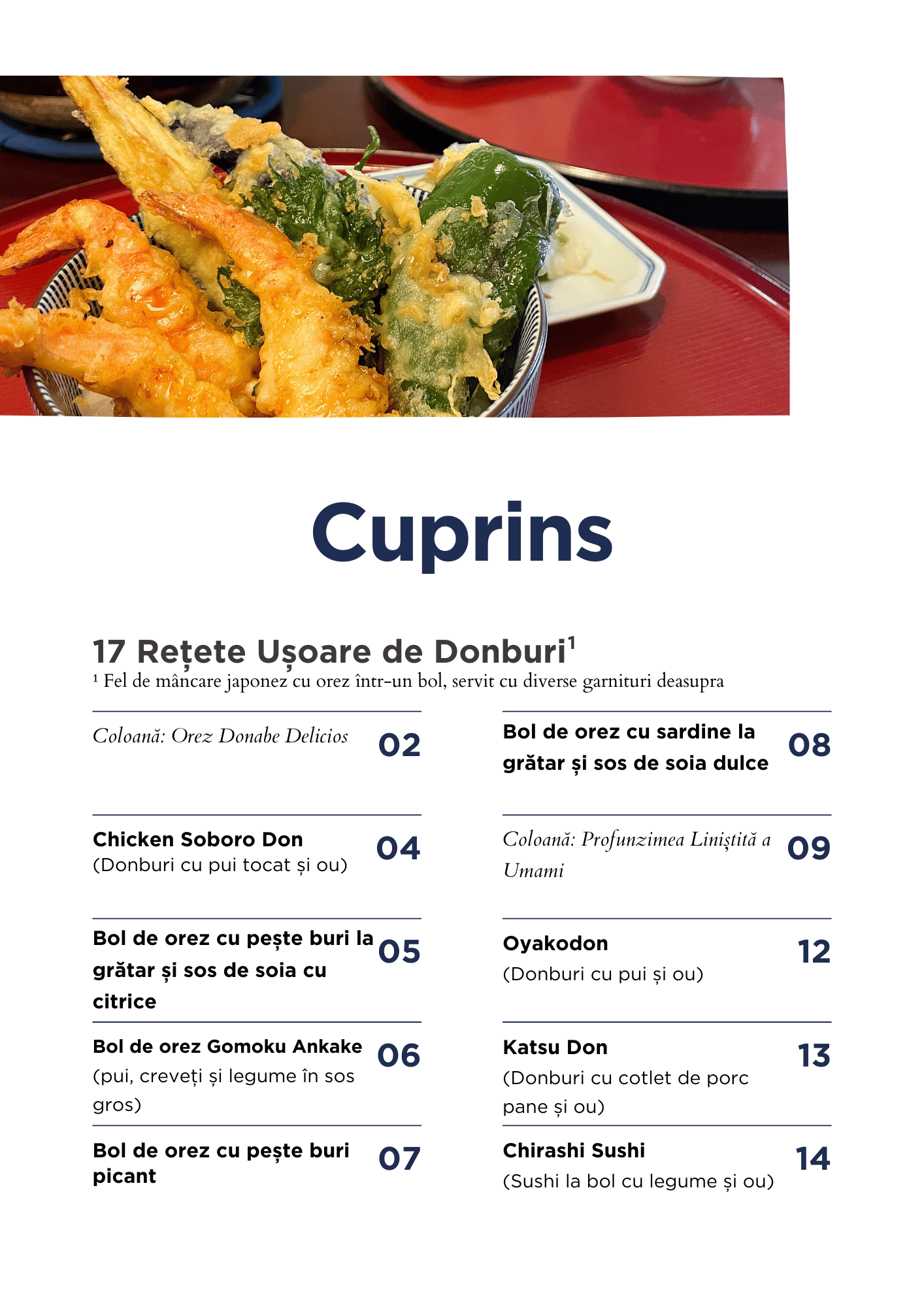 O carte de bucate japoneză caldă și primitoare, cu 17 rețete de donburi (boluri cu orez) pe care le gătim des acasă—multe dintre ele cerute de urmăritorii noștri. De la clasice precum Oyakodon (Donburi cu pui și ou) și Katsu Don (Donburi cu cotlet de porc pane și ou) până la favorite unice precum Bol de orez cu pește buri picant și Tsukimi Tororo Don (Donburi cu ignam ras și gălbenuș de ou), fiecare rețetă este simplă și ușor de pregătit pentru mesele de zi cu zi.