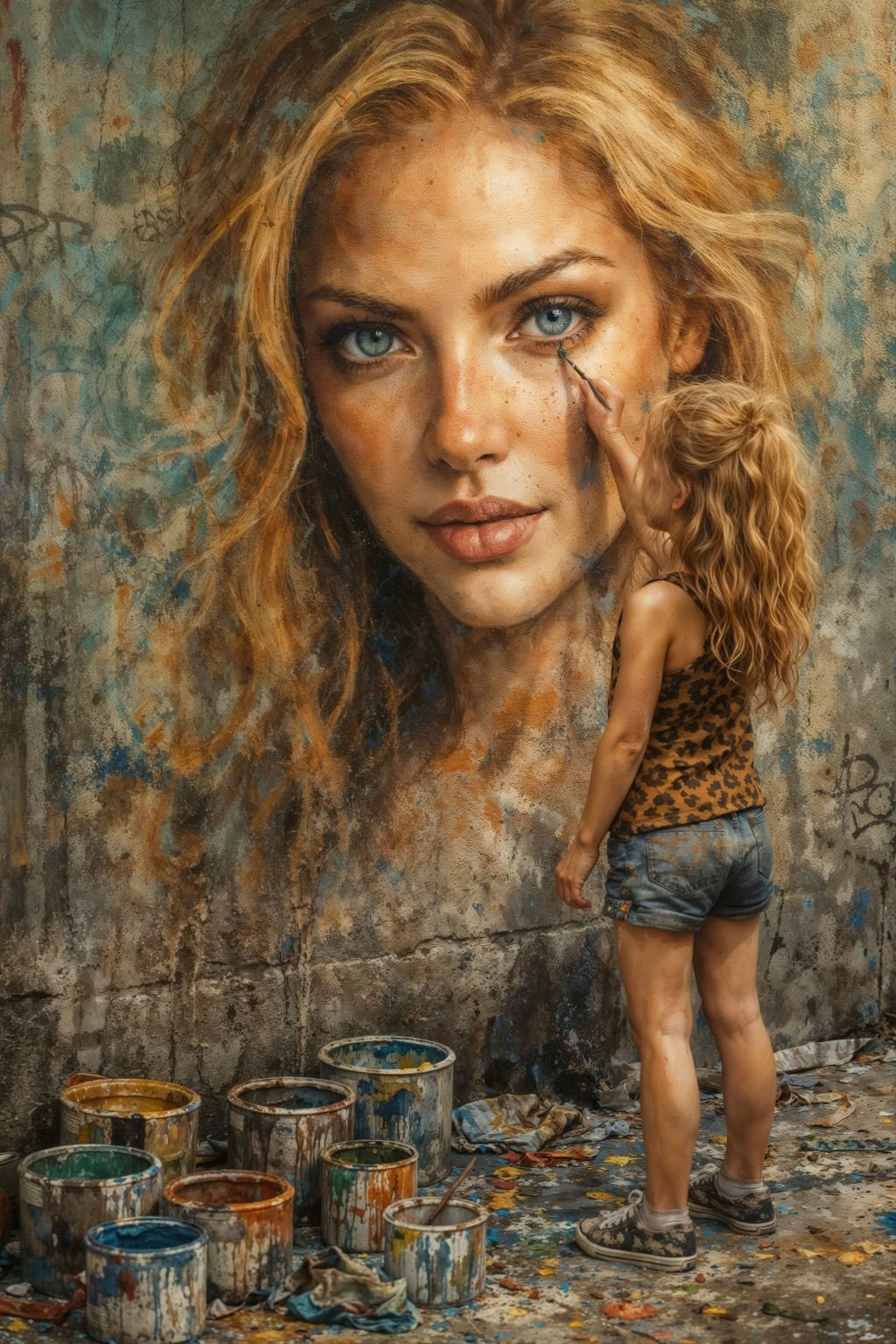 I stand small against a wall that feels impossibly huge, my hair a sunlit tangle and my hands steady despite the mess around me—paint buckets, stains, splatters, proof that I’ve been here for hours.