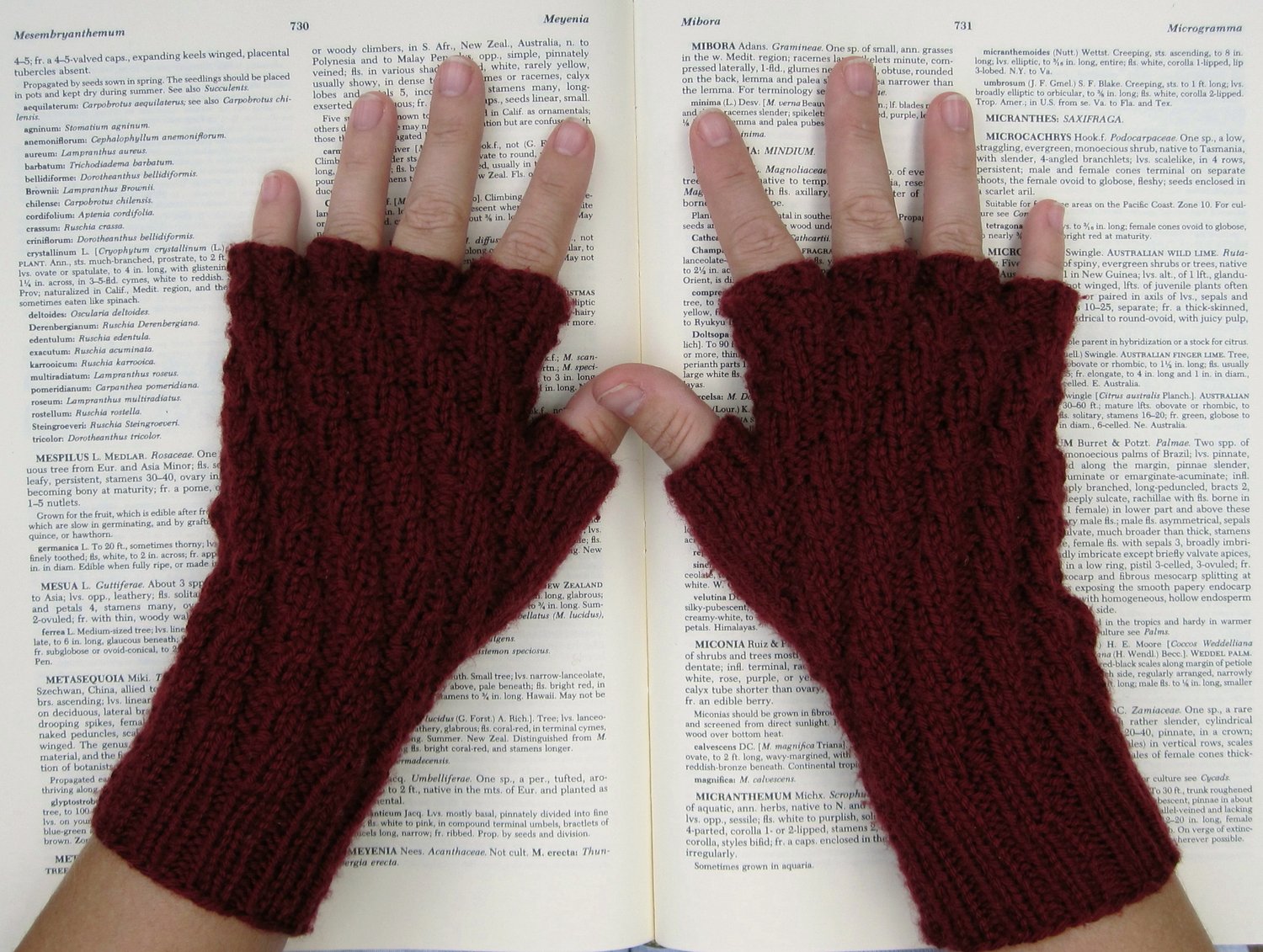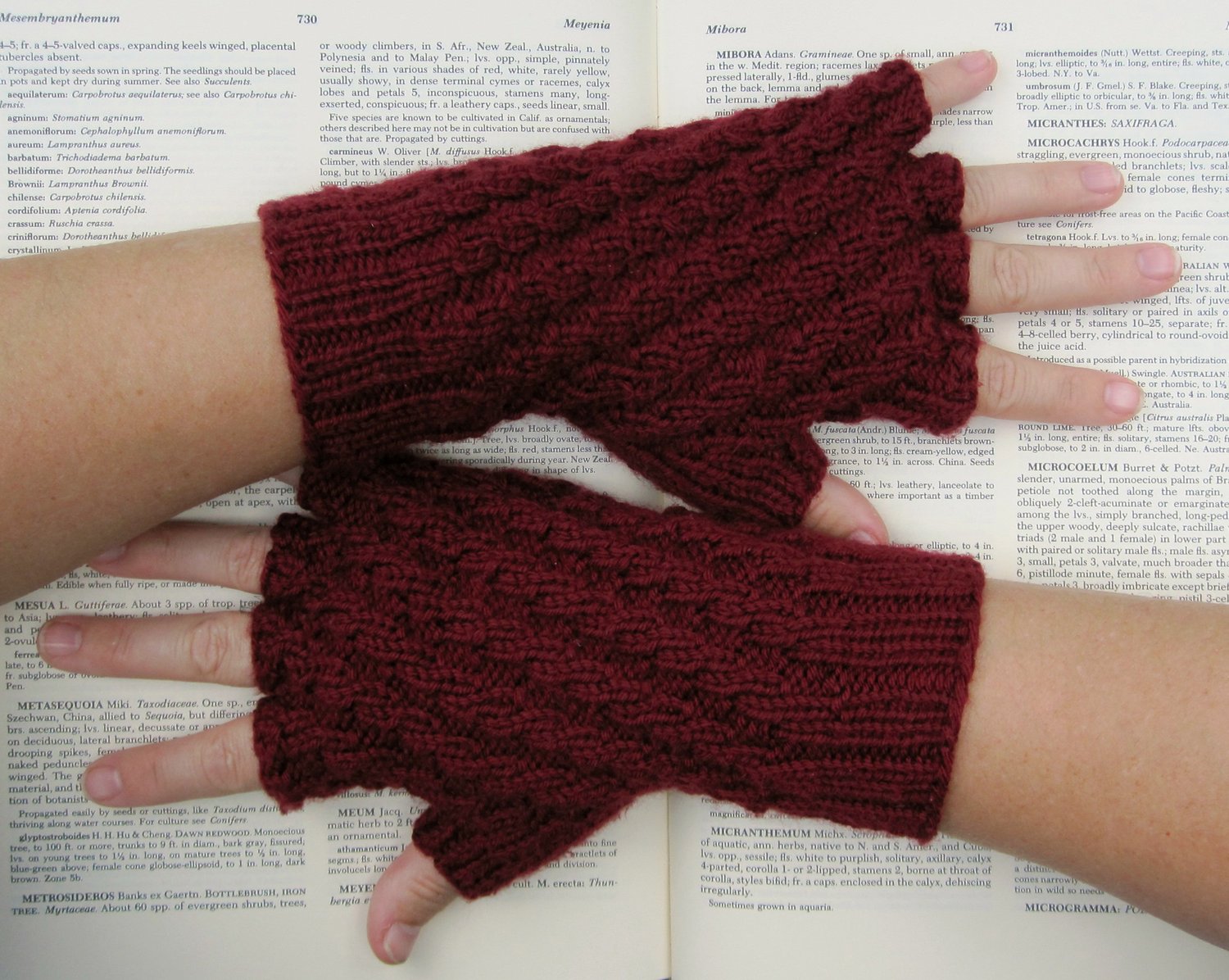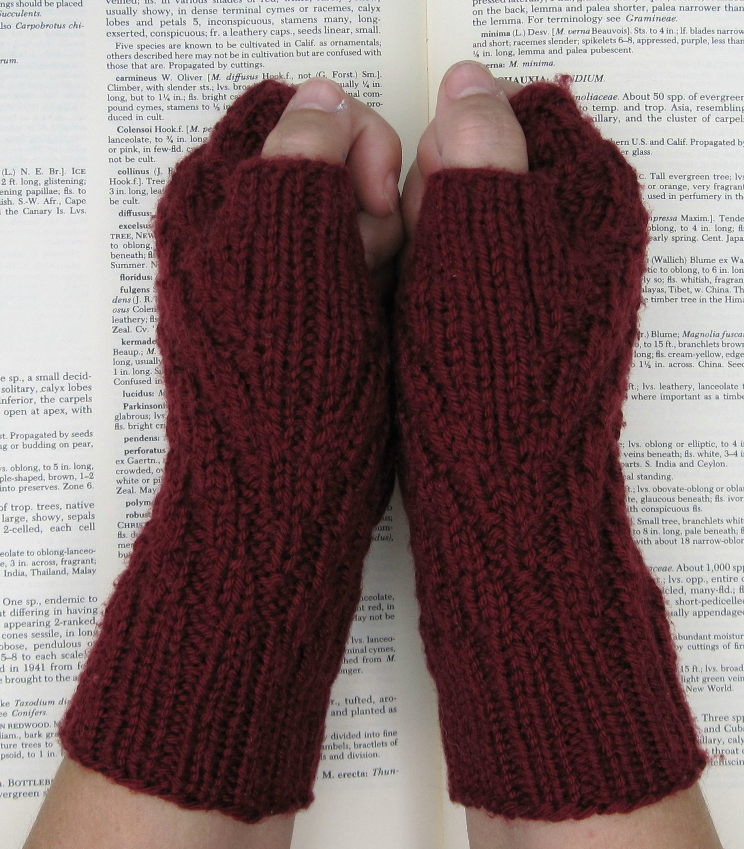 Fingerless gloves are such a fabulous opportunity to splurge on soft, luxurious yarns. They don’t take much yardage, and yet you get such joy from wearing them. These gloves were inspired by the facing pages of an old book that had a lovely marbled paper. Opposite sides of a sheet of paper are called the “recto” and the “verso.”