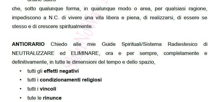 Sono partita dalla gabbia sociale che inizia con la registrazione all’anagrafe, proseguendo coi contratti di terzi sul proprio nome a propria insaputa e contro la propria volontà, e finendo col battesimo e i sacramenti, inclusi programmi inibitori, vincoli e sigilli, più o meno occulti, messi a punto da società e religione, programmi di lavaggio del cervello, ecc. Il tutto per creare una sorta di “sbattezzo” socio-religioso che permetta la liberazione del corpo e dell’anima.