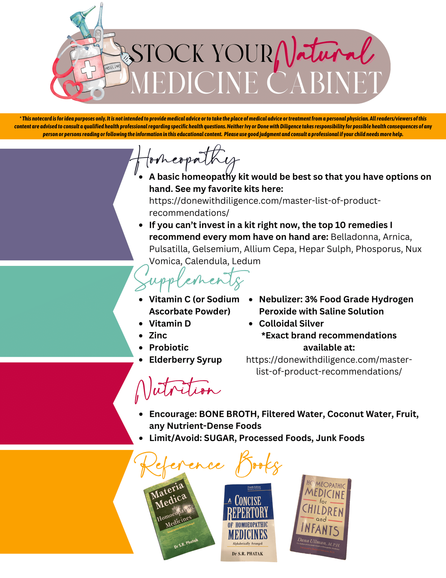 Ready to stock your natural medicine cabinet? This checklist can help! Find more resources and details about how to use your natural medicine cabinet at https://donewithdiligence.com/remedy-with-diligence/