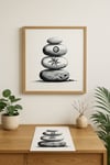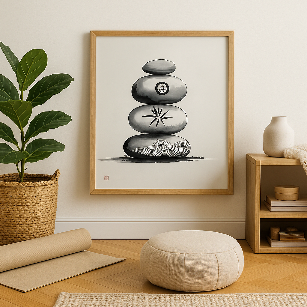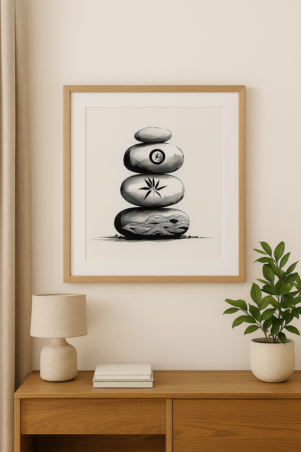 Bring serenity into your home with this minimalist Japanese sumi-e art print, featuring a delicate stack of zen stones adorned with traditional brush motifs — bamboo leaf, flowing waves, and calligraphy.