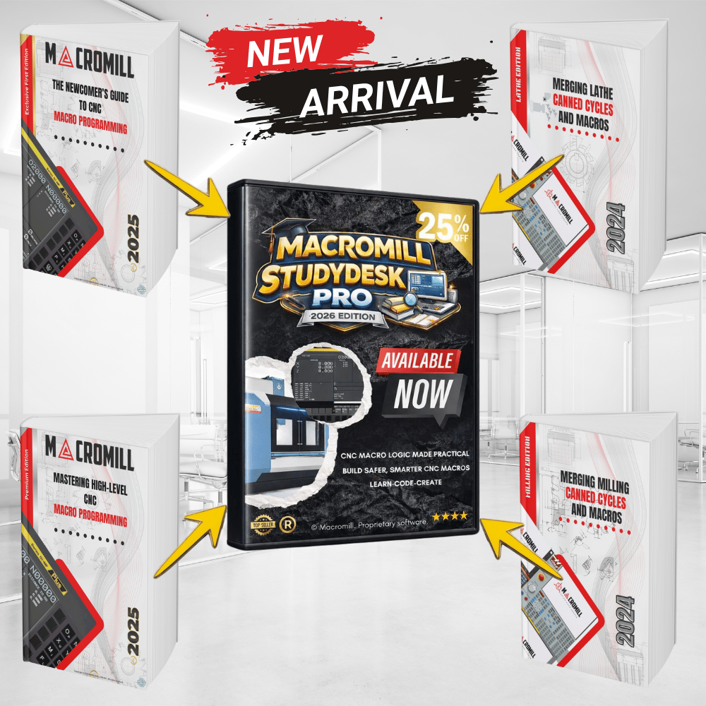 MACROMILL STUDYDESK PRO – 2026 Edition is a professional CNC macro learning and automation platform that combines software tools and the complete MacroMILL CNC Programming book collection into one integrated learning environment.