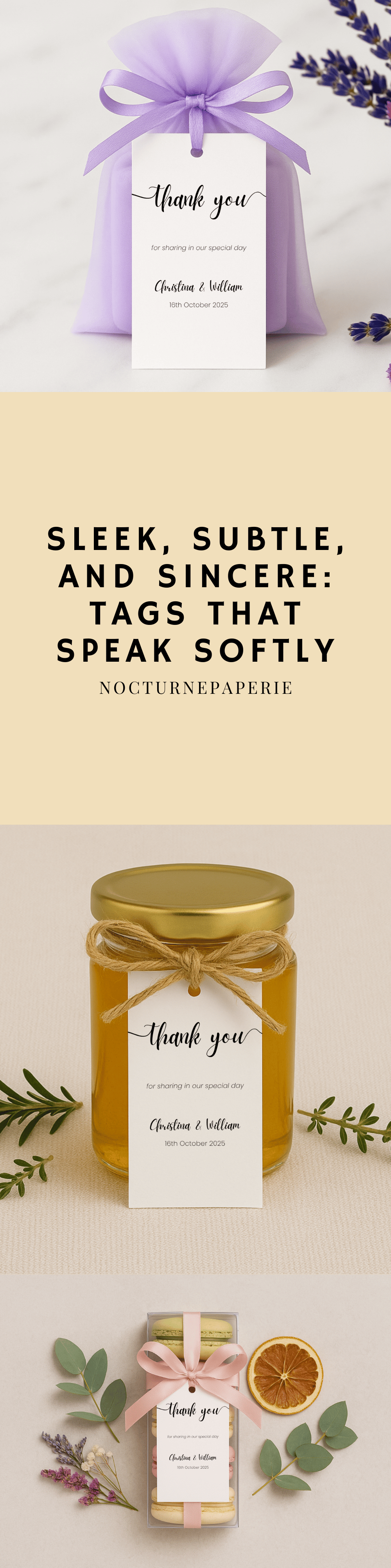 Keep your wedding favors chic with this minimalist wedding thank you tag template. The editable Canva printable stationery tag makes a personalized wedding card that’s perfect for guest gifts.