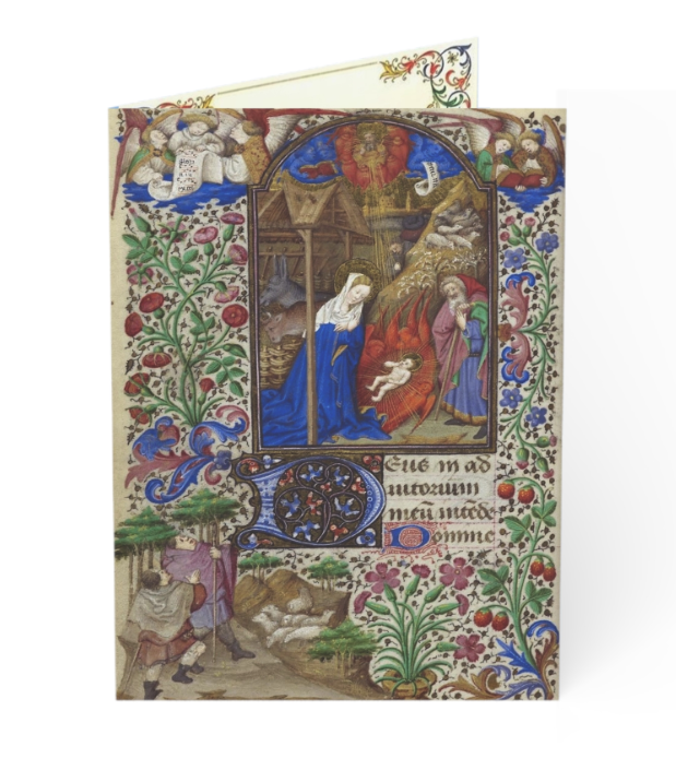 This elegant 5" × 7" card features a richly detailed Nativity miniature from a 15th-century French Book of Hours, reproduced with exceptional clarity and colour. The scene is surrounded by the intricate floral and vine motifs characteristic of late medieval illumination, offering a vivid glimpse into the devotional artistry of the Gothic period.