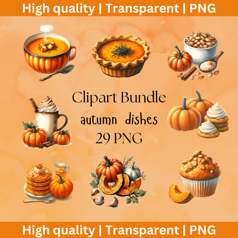 Get ready to add a touch of autumn to your designs with this charming collection of 20 watercolor autumn-themed dishes in digital clipart! This bundle includes: