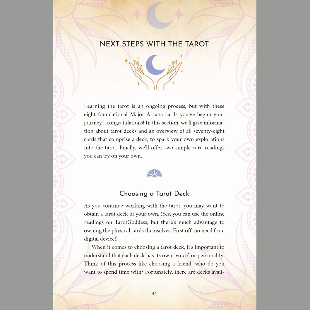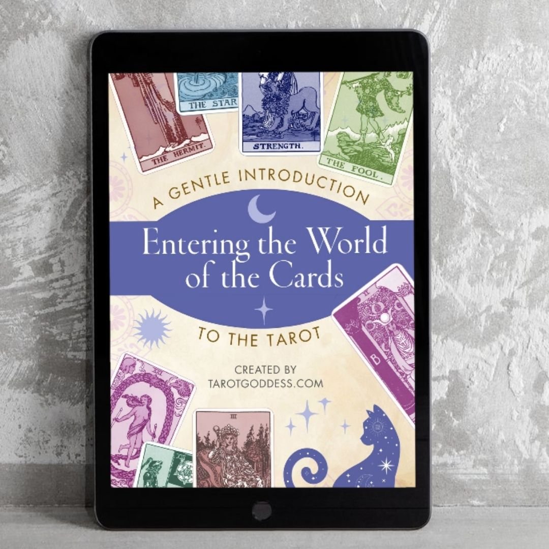 Continue the Journey with Tarot Goddess's companion guidebook for those yearning to learn the tarot. The tarot consists of 78 cards—a somewhat overwhelming proposition. Entering the World of the Cards: A Gentle Introduction to the Tarot offers a more welcoming approach.