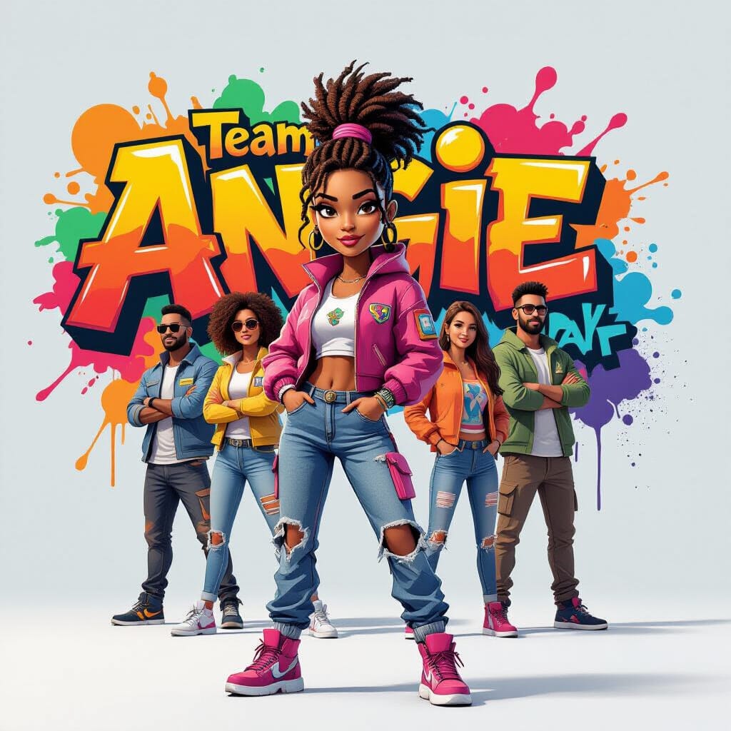 Description: An energetic and diverse team stands confidently in dynamic streetwear, with a bold, graffiti-style "TEAM ANGIE" logo splashed with vibrant paint behind them. This piece captures a spirit of creativity, unity, and urban cool, making it perfect for collectors who appreciate street art, youthful energy, and powerful team-based imagery.