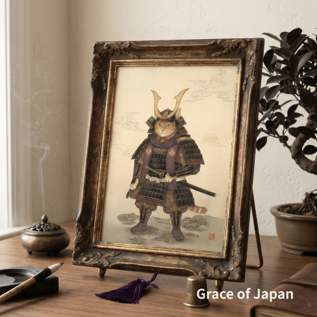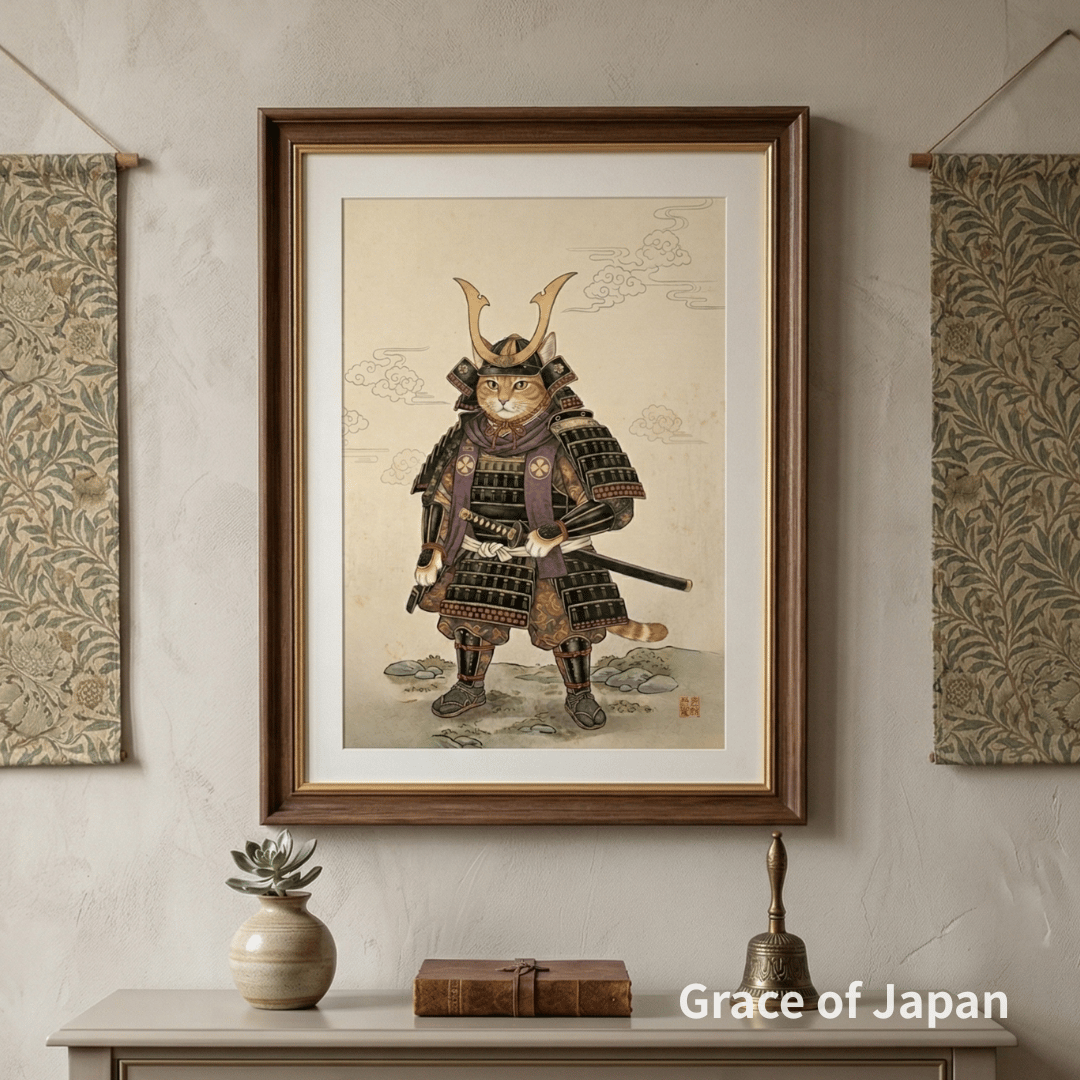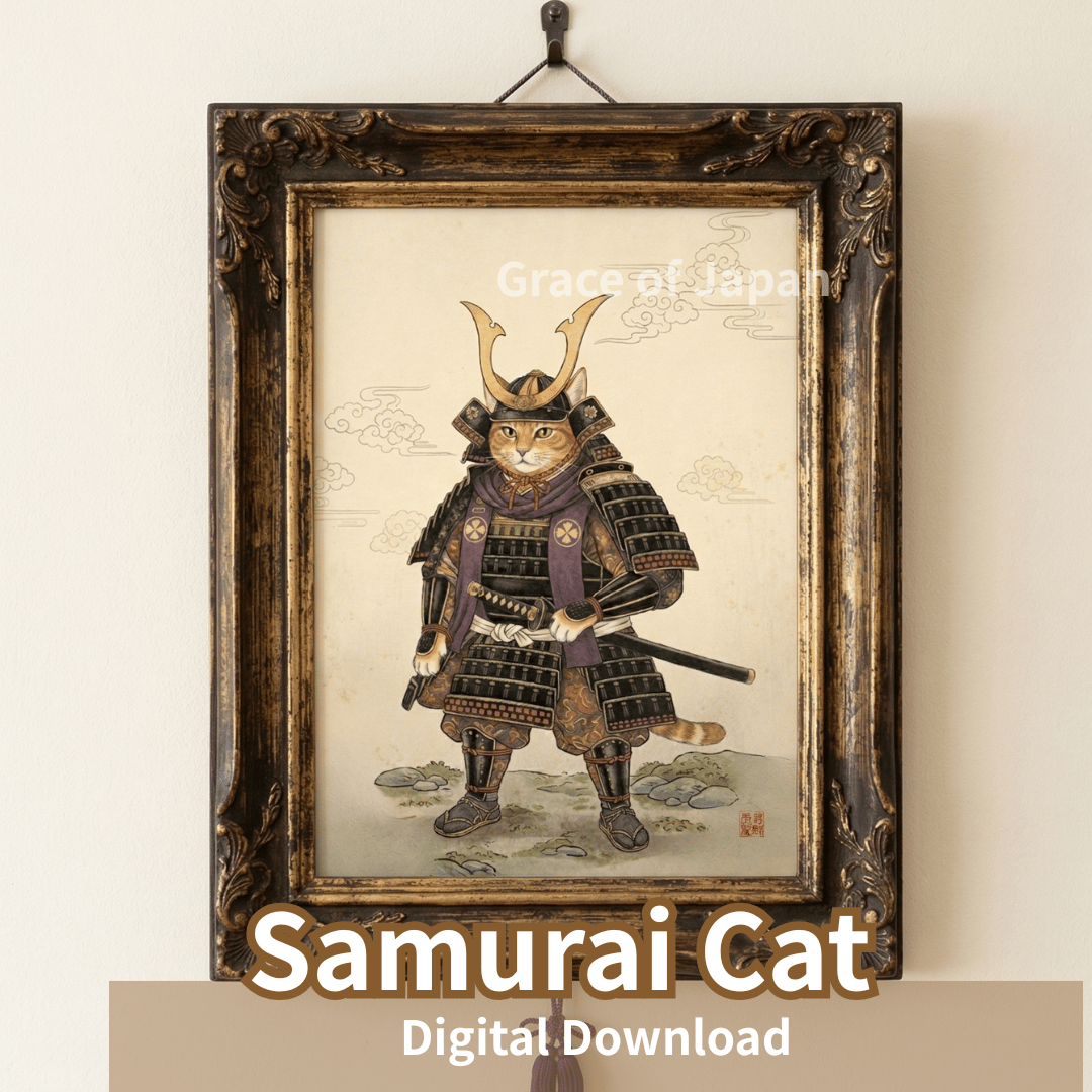 Perfect for cat lovers, Japan enthusiasts, and anyone who enjoys unusual and stylish wall decor, this printable artwork adds personality, humor, and a touch of warrior spirit to your home or office.