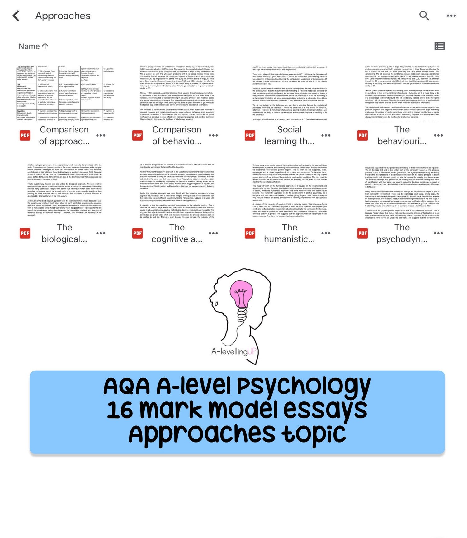 This pack contains all the model 16 mark essays that I wrote on the Approaches topic during my A-levels for AQA A-level Psychology. These essays helped me achieve an A* in Psychology and I hope they help you to do the same!