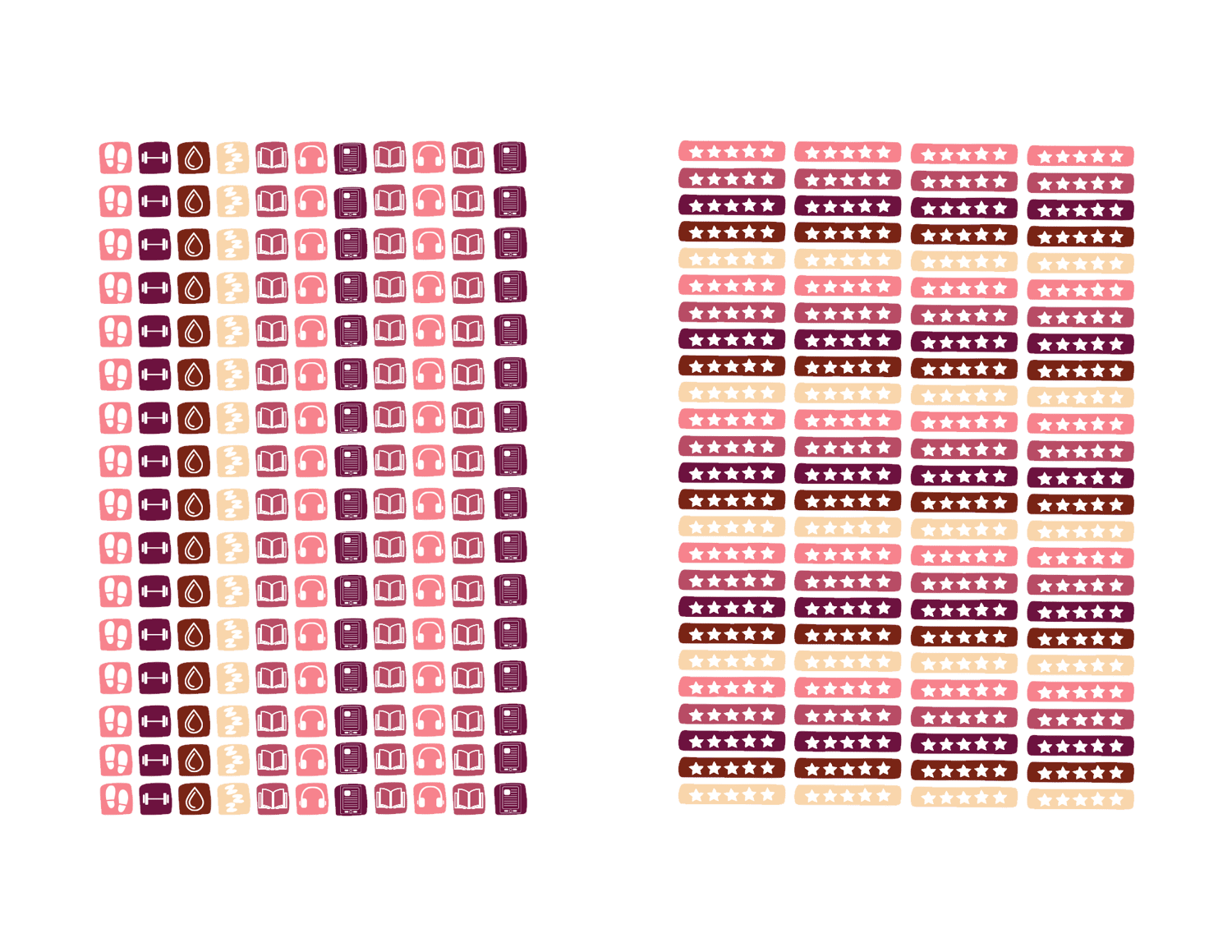 - 31 sets of 7 daily icons: steps, water, sleep, exercise, book, headphones, e‑reader