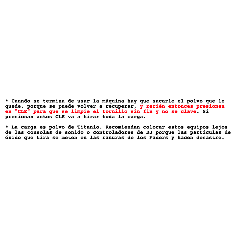 * Cuando se termina de usar la máquina hay que sacarle el polvo que le quede, porque se puede volver a recuperar, y recién entonces presionan en "CLE" para que se limpie el tornillo sin fin y no se clave. Si presionan antes "CLE" va a tirar toda la carga.