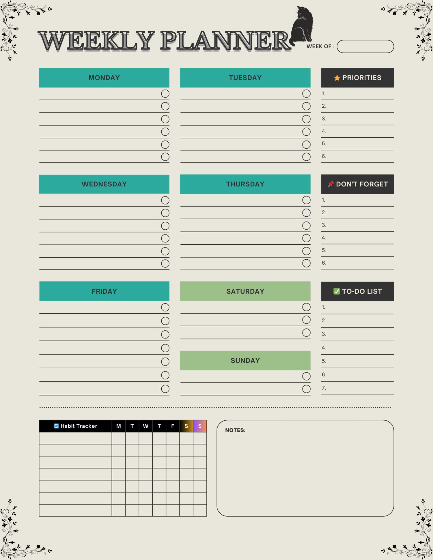 ✔️ One-page Weekly Overview: Plan your week from Monday to Sunday, set priorities, track habits, and list your tasks.