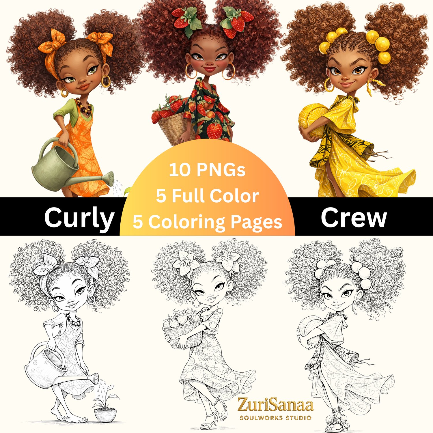 This 10-PNG digital set includes 5 vibrant full-color illustrations and 5 black-and-white coloring pages, featuring expressive girls with big personalities, playful poses, and uplifting energy. Each image is designed to inspire imagination while offering versatility for both print and digital projects.