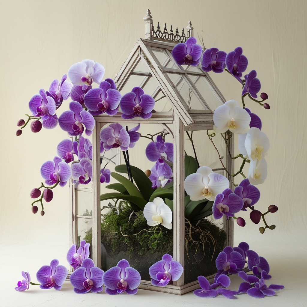 A delicate, Victorian-style miniature greenhouse with intricate wooden latticework and a delicate metal roof, set against a soft, creamy white background, is overflowing with an exquisite arrangement of velvety violet and pure white orchids, their petals delicately ruffled and curved, with subtle gradations of purple and white hues, the plants varying in size and shape, some with delicate aerial roots, others with robust stems, all densely packed within the tiny glass enclosure, with a few stray blooms spilling over the edges, creating a sense of lushness and serenity.
