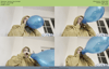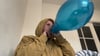 Hooded Sammy blows a blue balloon until it goes BANG!