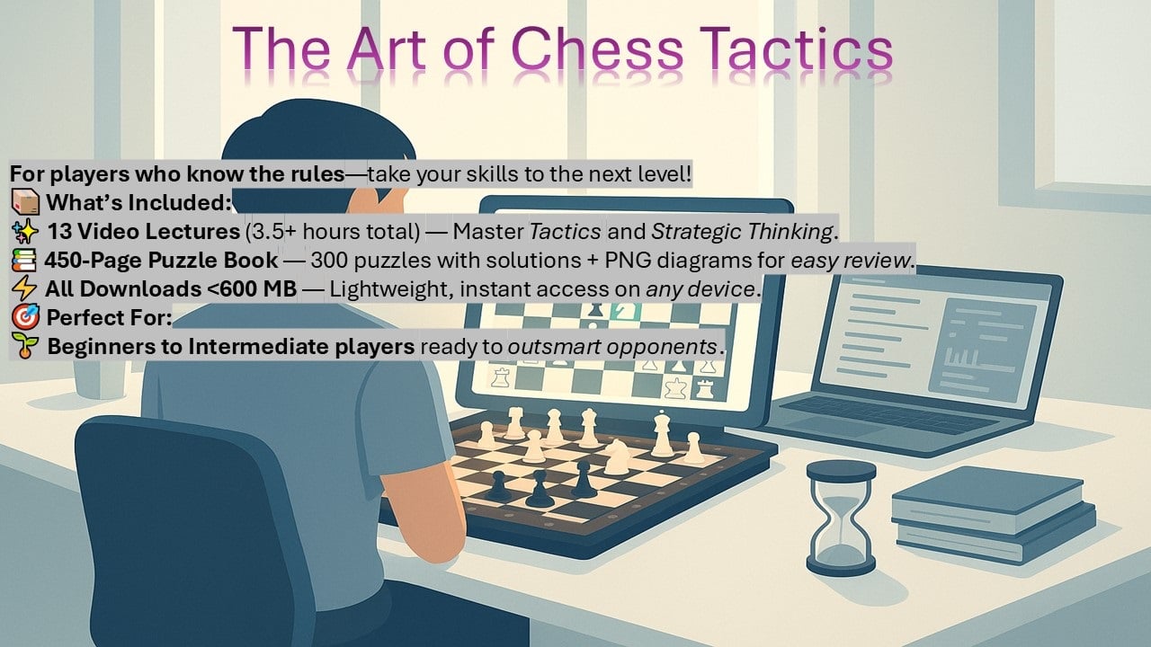This course teaches an analytical approach to finding tactics in chess. It does not rely solely on memorizing patterns but instead emphasizes a reliable method that can be applied in practical games.