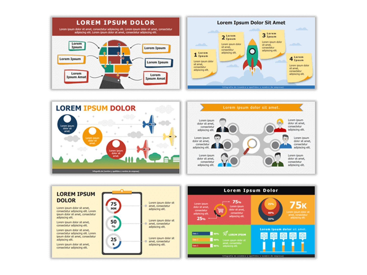 - Las plantillas para crear infografías con orientación horizontal están en 6 versiones de colores. (azul, rojo, amarillo-naranja, verde y 2 versiones multicolores)