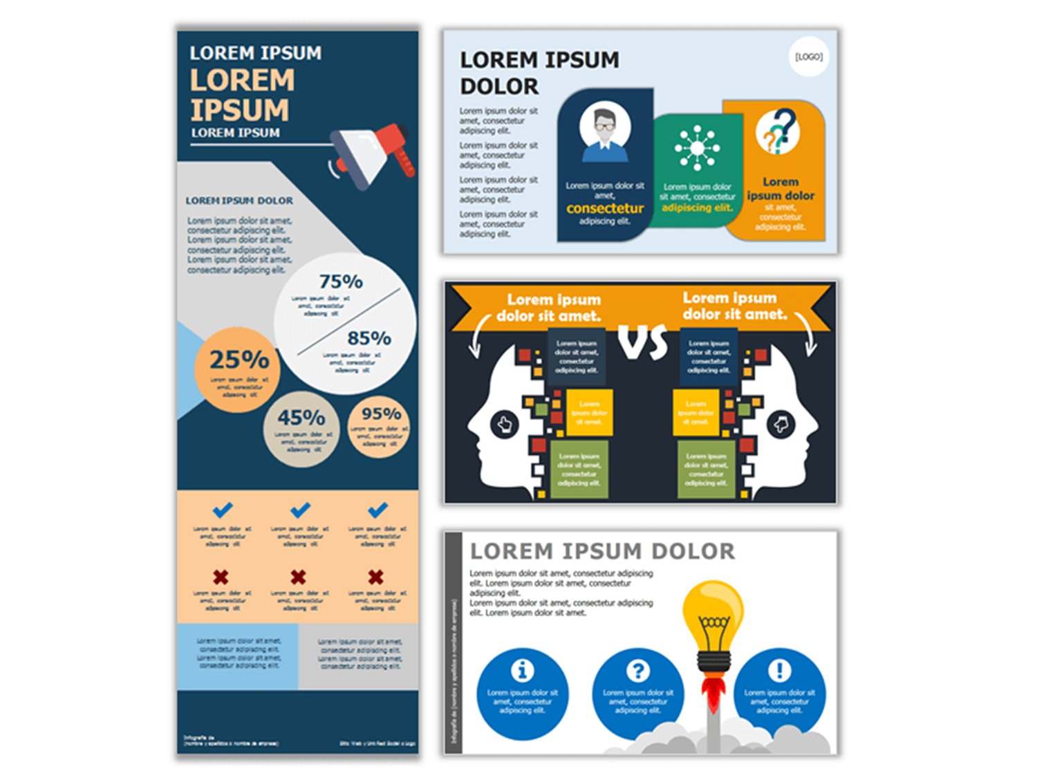 - 180 Plantillas para crear Infografías: 70 con orientación vertical y 110 con orientación horizontal.