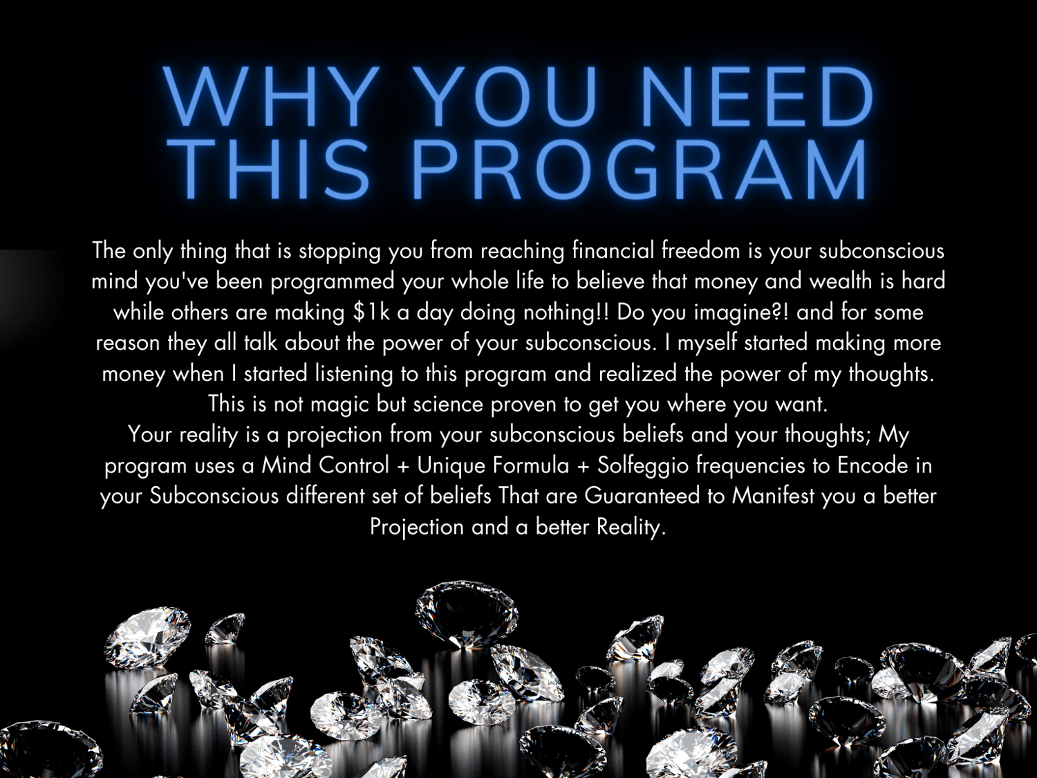 My program uses a Mind Control + Unique Formula + Solfeggio frequencies to Encode in your Subconscious different set of beliefs That are Guaranteed to Manifest you a better Projection and a better Reality.