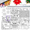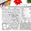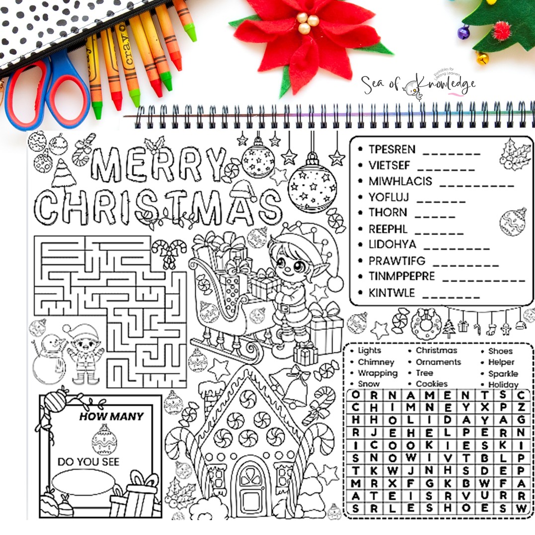 Each mat features cute elves, presents, lights, stockings, candy canes, and winter icons for coloring and visual engagement.