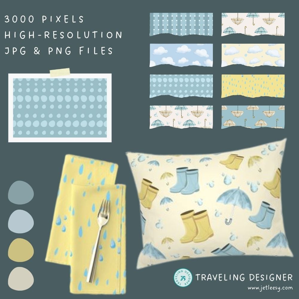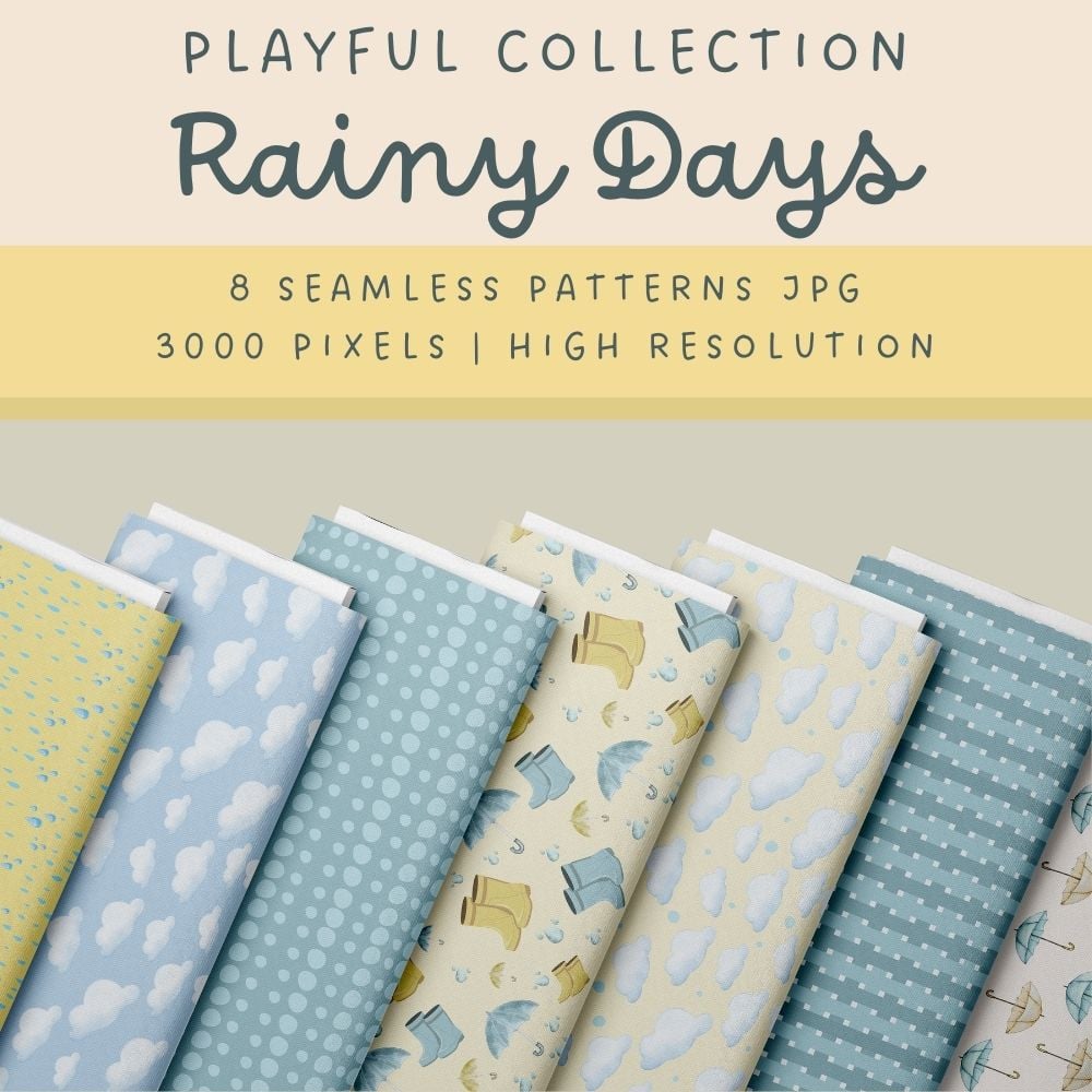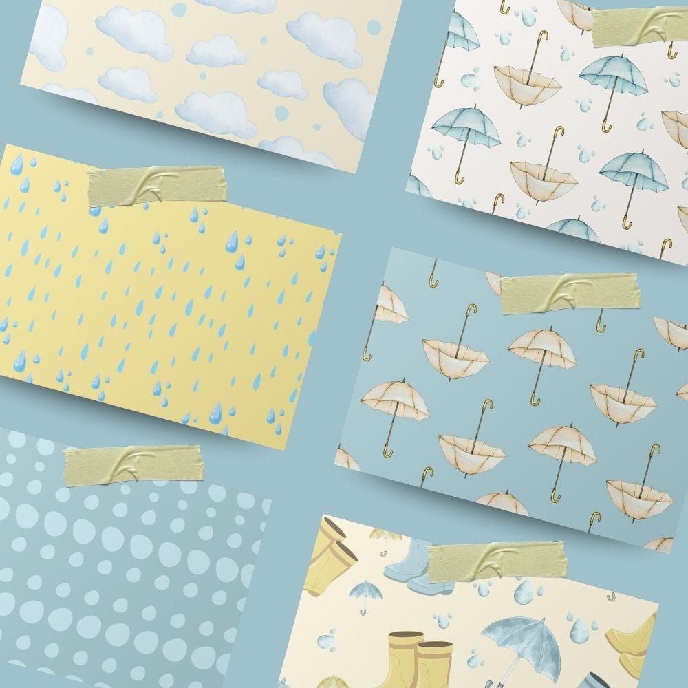 This set includes 8 seamless patterns, carefully balanced with soothing blues, warm neutrals, and whimsical rainy-day motifs. Perfect for creators who want designs that feel comforting, lighthearted, and timeless — without being overly childish.