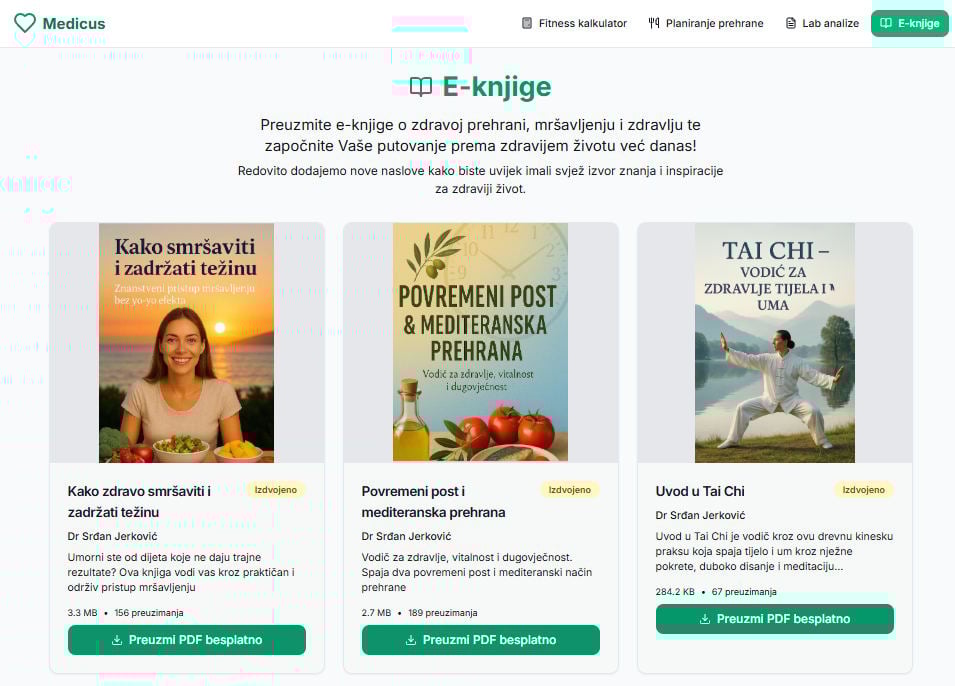 Otkrijte znanje koje mijenja navike! Preuzmite stručne, kratke i jednostavne e-knjiga o prehrani, tjelesnoj aktivnosti, mršavljenju i zdravlju koje potpisuje Dr. Srđan Jerković i tim Medicus stručnjaka. Učite, motivirajte se, mršavite, budite zdraviji i zadovoljniji