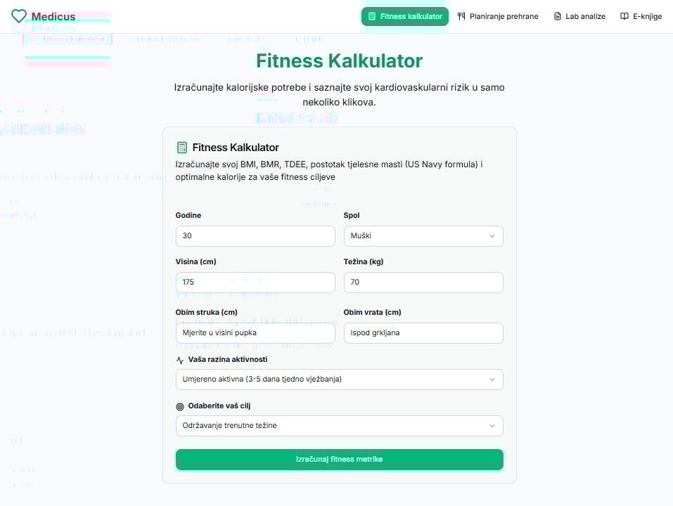 Izračunajte svoj BMI, BMR, TDEE, postotak masnoće i idealan unos kalorija. Pratite napredak i postavite realne ciljeve za učinkovito i održivo mršavljenje.