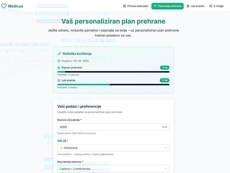 Zaboravite na generičke dijete! Svaki mjesec kreirajte personalizirani 7-dnevni jelovnik prilagođene vašim ciljevima (mršavljenje, održavanje, mišićna masa),novim kalorijskim potrebama i preferencijama.