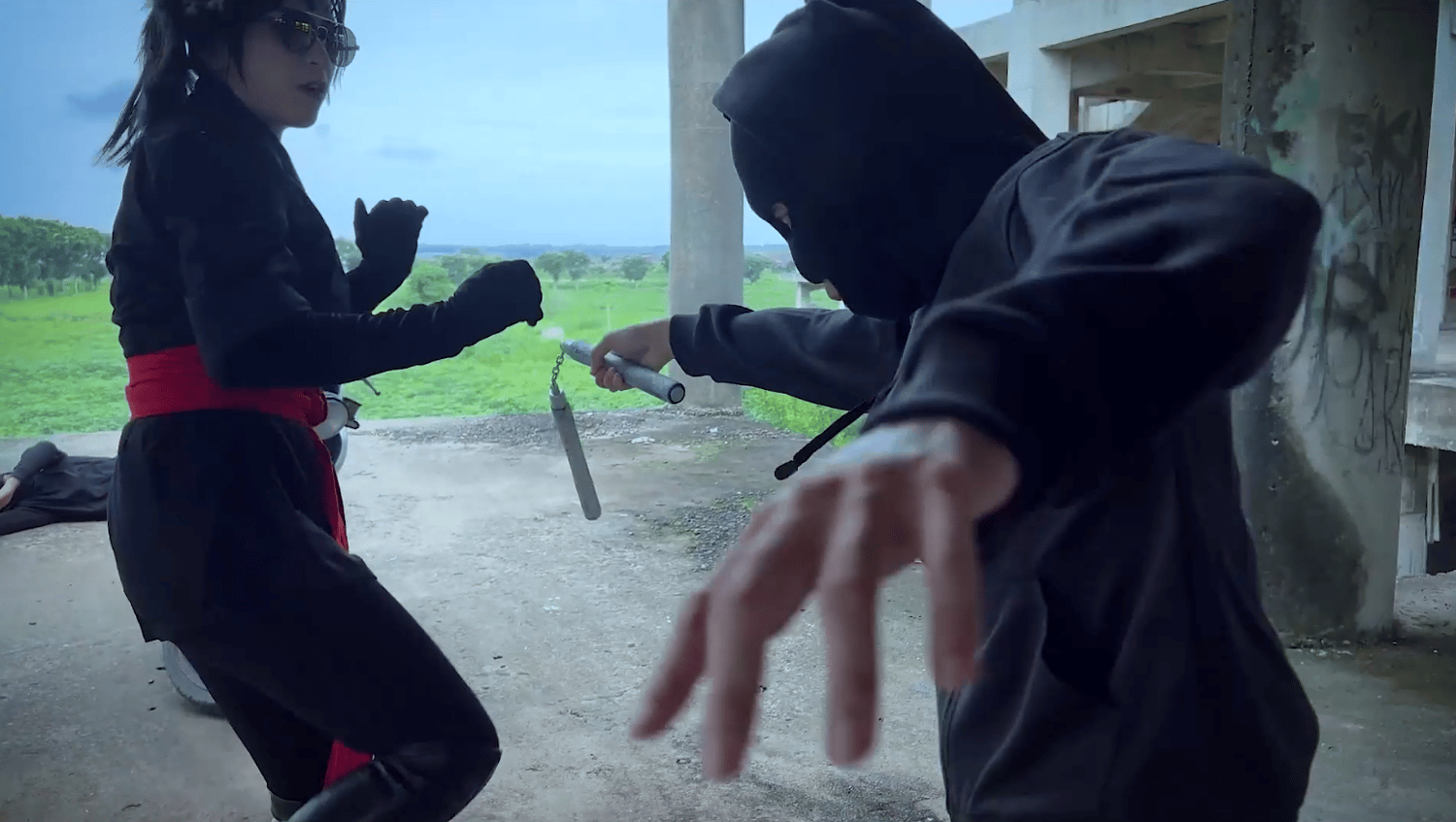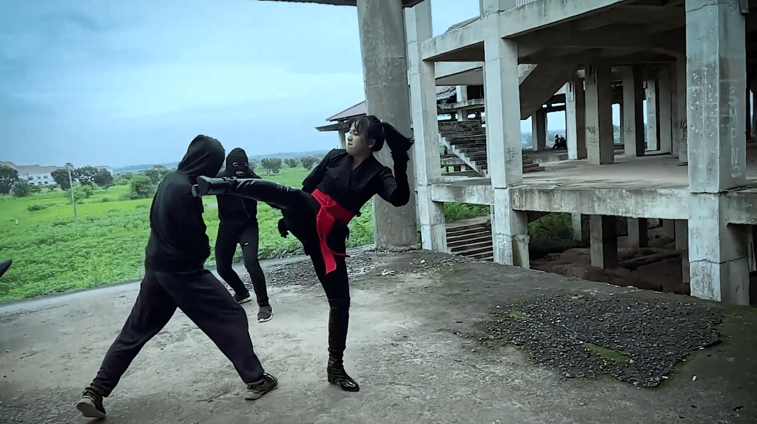 The plot: Chintya is wandering in the countryside on her bike when she notices an abandoned building nearby. She drives there and is attacked by two baddies, one has a nunchaku. She easily disposes of them with kicks (lots of slowmo if you like this!)