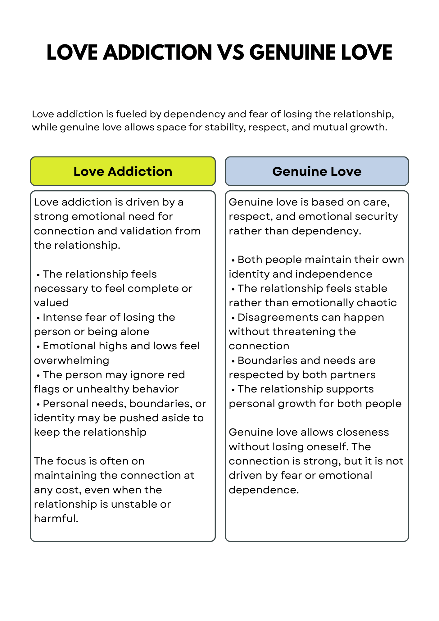 While both love addiction and trauma bonding involve intense emotional attachments, the context and dynamics differ significantly. Love addiction is more about the pattern of seeking fulfillment through romance or relationships to the point of having a detrimental effect on one’s life, whereas a trauma bond is specifically related to the dynamics of an abusive relationship.
