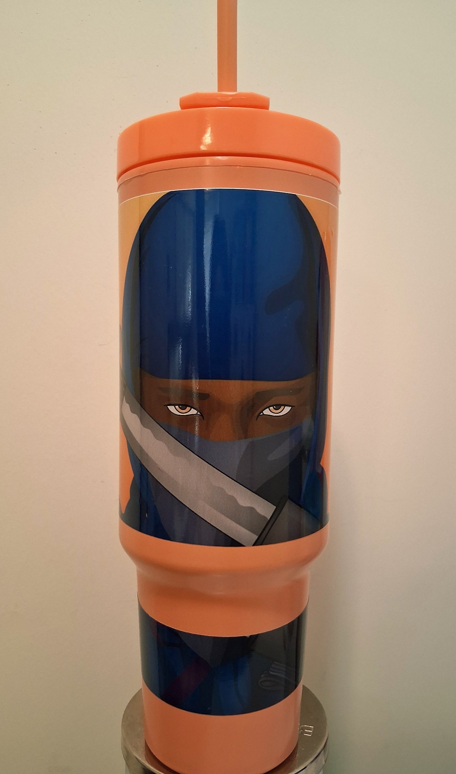 Orange sherbert 40 oz tumbler with a ninja sword in hand and ready to do their job