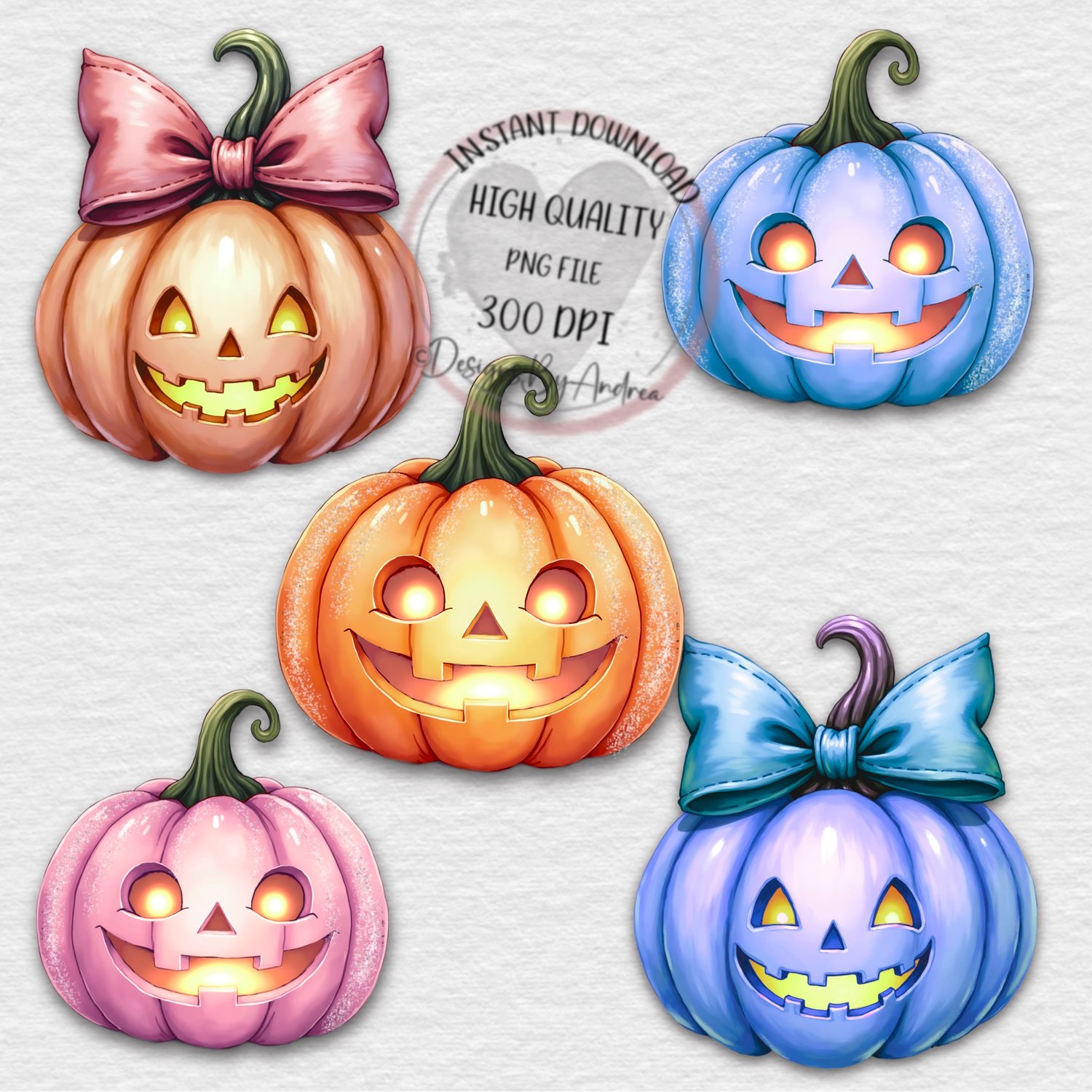Halloween pumpkins n bows. Incl text files + optional background. Personalise. 18 PNGs. Instant download, sublimation, print, DTF, UVDTF.