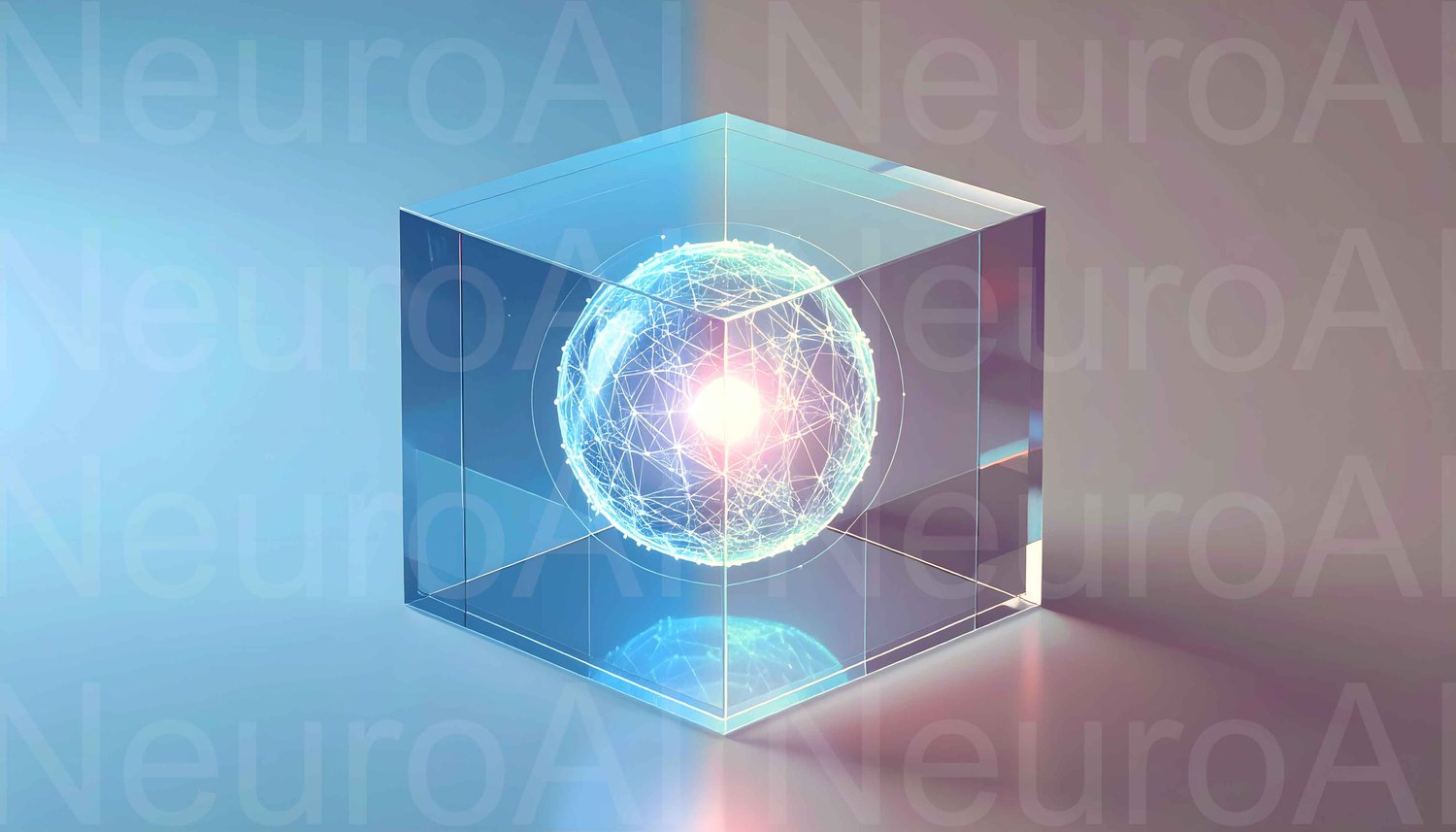 A glowing neural network or data structure trapped inside a transparent glass cube. This image abstractly represents the concepts of artificial intelligence, big data, or quantum computing. The light and shadow effects create a modern and sophisticated feel, making it ideal for projects related to technology and innovation.