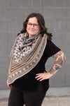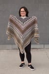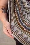Prismatic is knit top to bottom in a triangle shape. The shawl features garter stitch, slipped stitches, and a mosaic triangle pattern to give the shawl depth and texture.