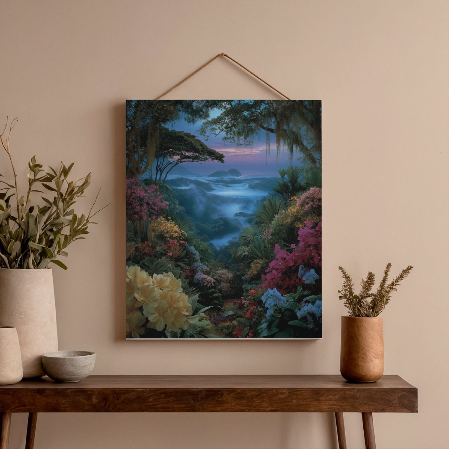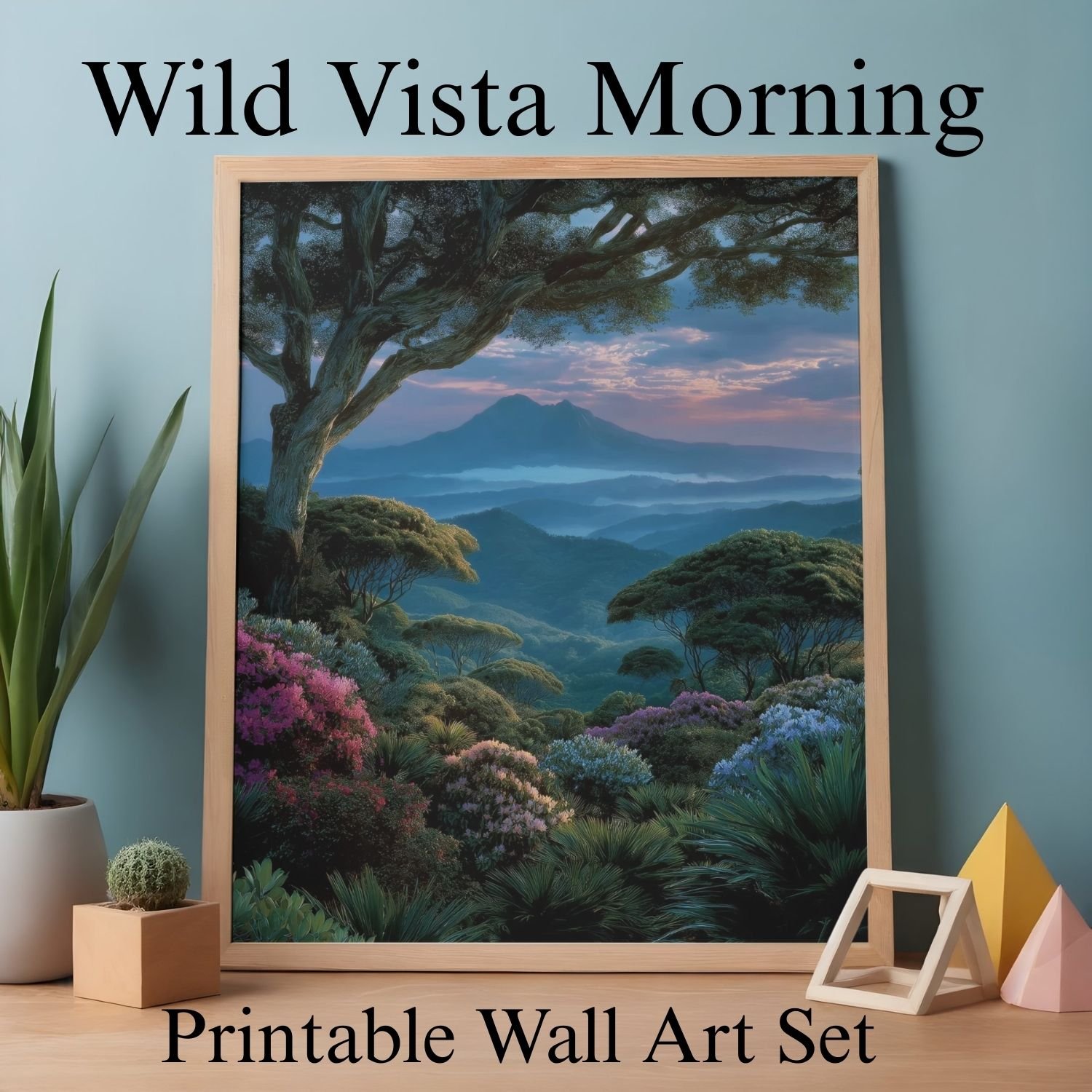 Bring a sense of calm into your space with the Wild Vista Morning printable wall art set. Each piece captures the quiet beauty of distant mountains, soft mist drifting through peaceful valleys, and a blue‑to‑purple morning sky framed by lush forests and bright wildflowers. These prints are designed to create a gentle, grounding atmosphere—perfect for bedrooms, reading corners, entryways, or any place that needs a moment of serenity.