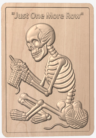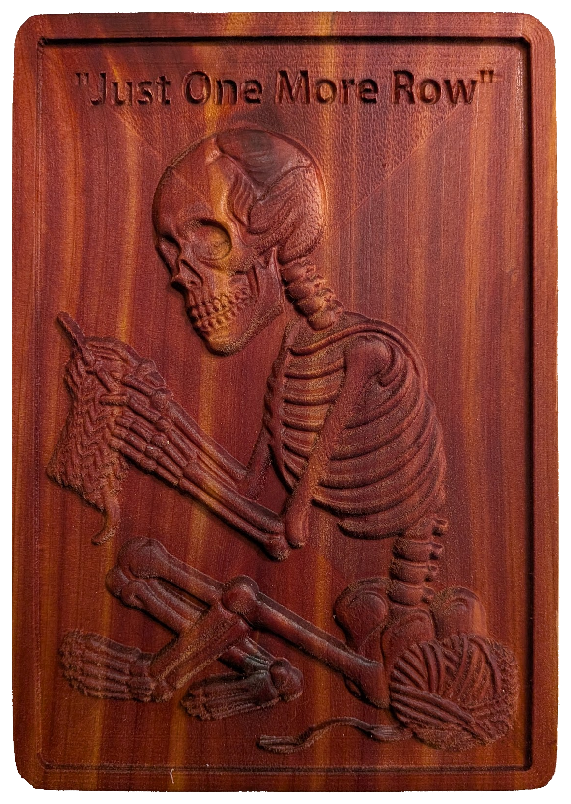 “Just One More Row” is a detailed bas-relief design depicting a skeleton absorbed in crochet—capturing the timeless truth that makers never stop just yet. The composition balances dark wit with warmth, making it equally suited for display, gifting, or conversation pieces.