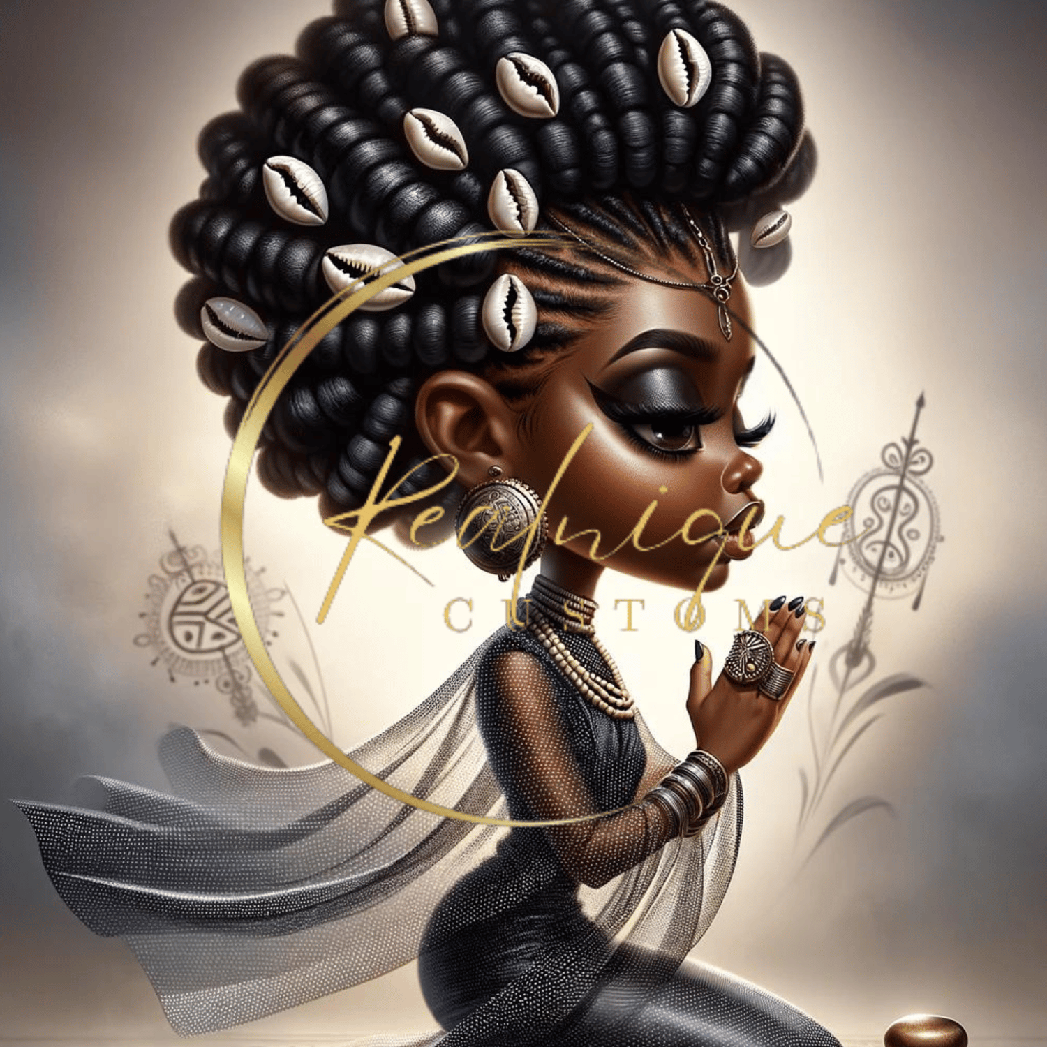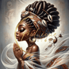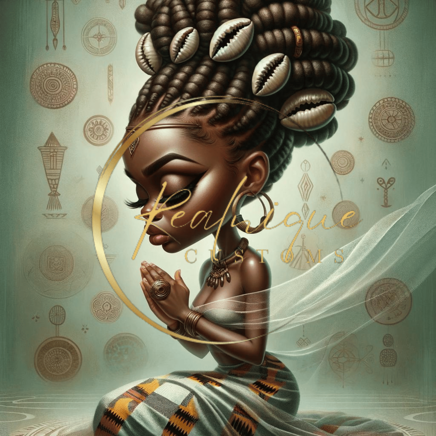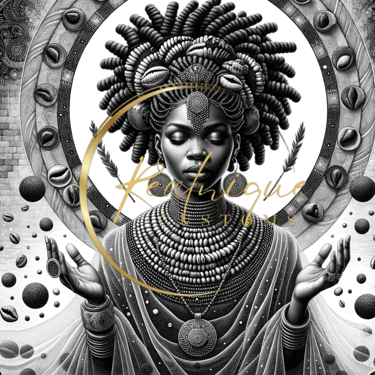 Experience the profound beauty and spirituality with "Serene Elegance," a captivating digital artwork that celebrates African heritage and grace. This stunning piece features a young African queens in a meditative pose, adorned with intricate jewelry, a majestic hairstyle embellished with cowrie shells, and a flowing gown that adds to her ethereal presence.