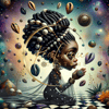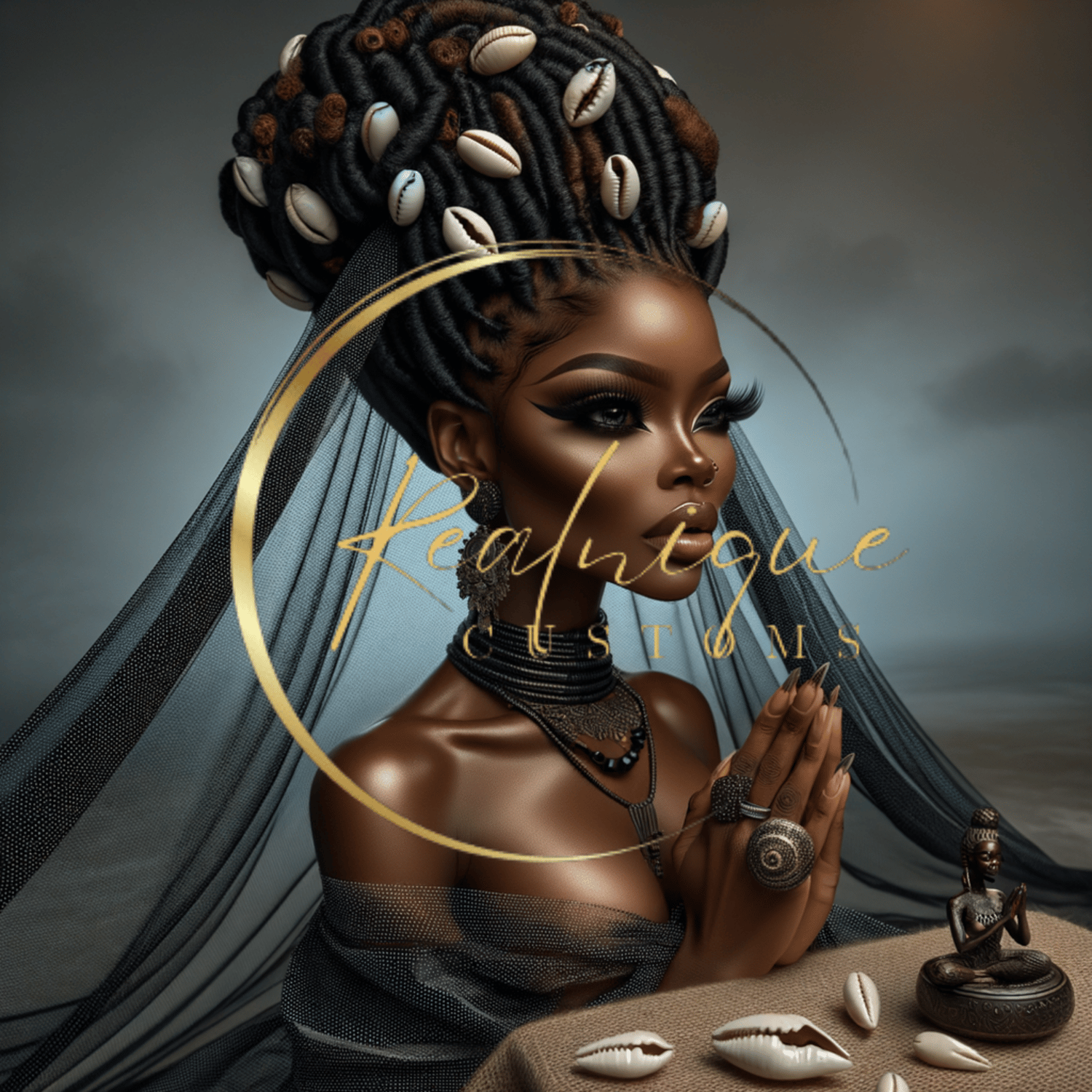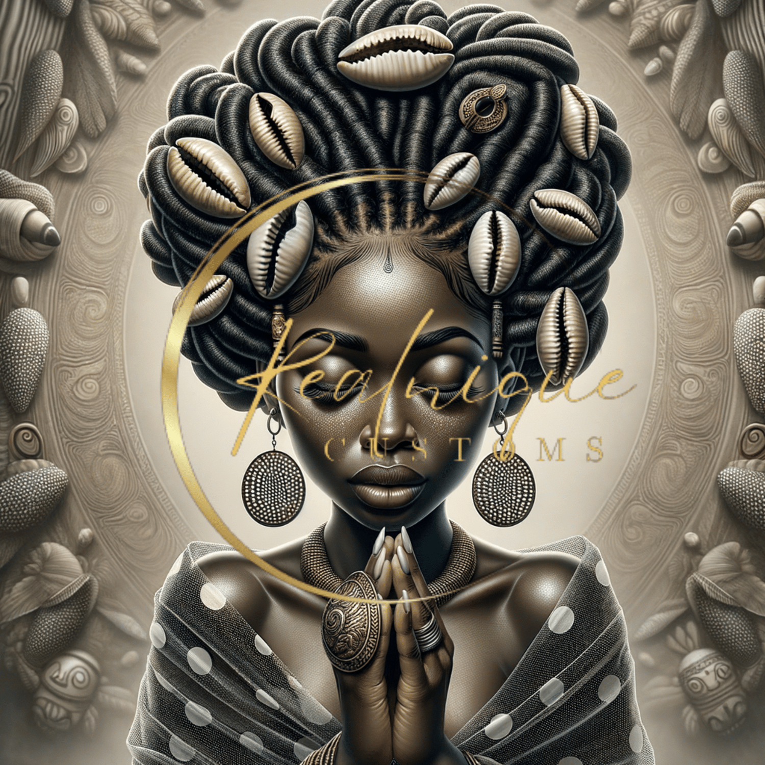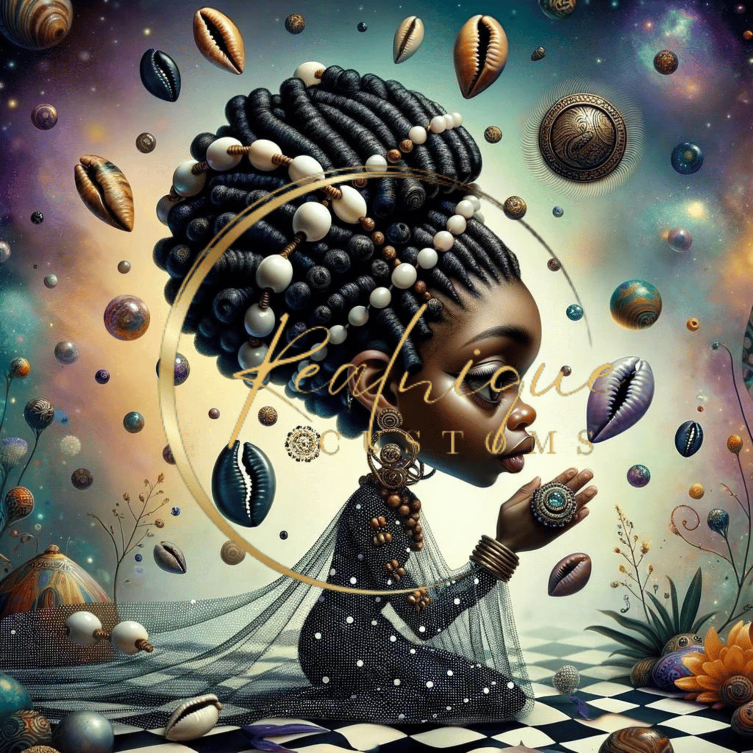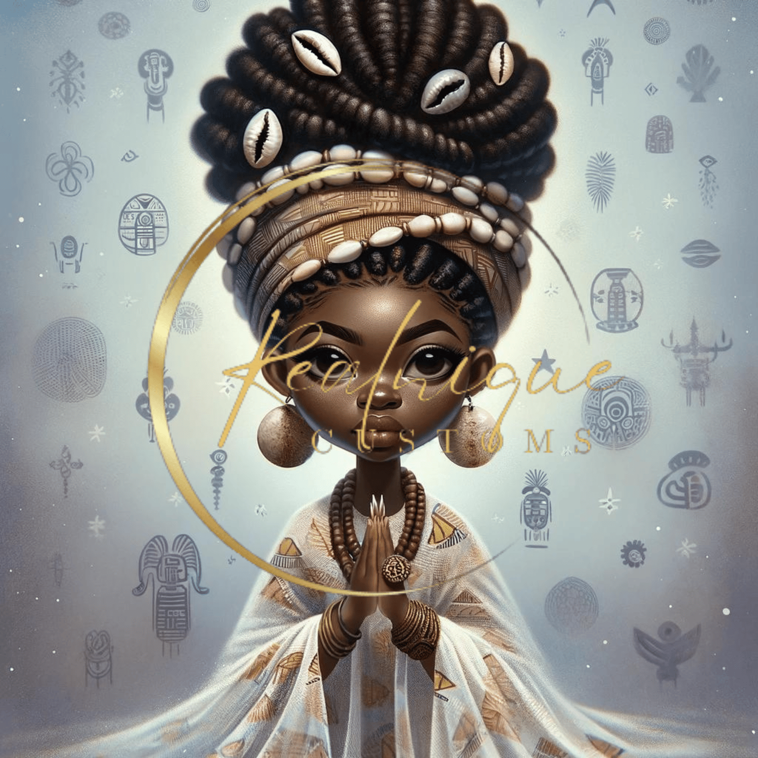 Experience the profound beauty and spirituality with "Serene Elegance," a captivating digital artwork that celebrates African heritage and grace. This stunning piece features a young African queens in a meditative pose, adorned with intricate jewelry, a majestic hairstyle embellished with cowrie shells, and a flowing gown that adds to her ethereal presence.