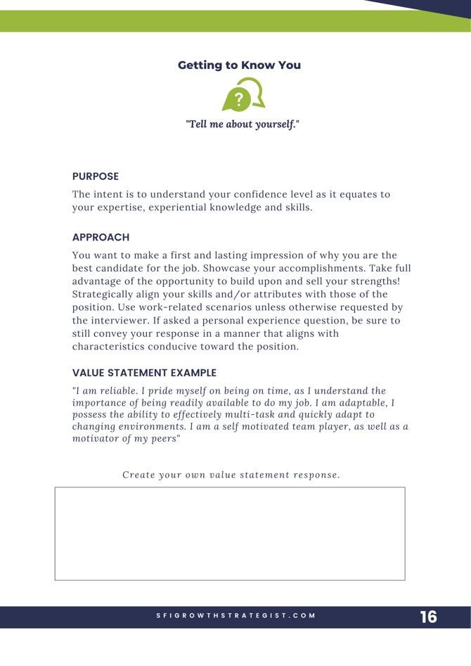 Comprehensive Question Coverage: Explore common and challenging interview questions, from getting to know you to situational competency-based, and learn how to approach each one effectively.