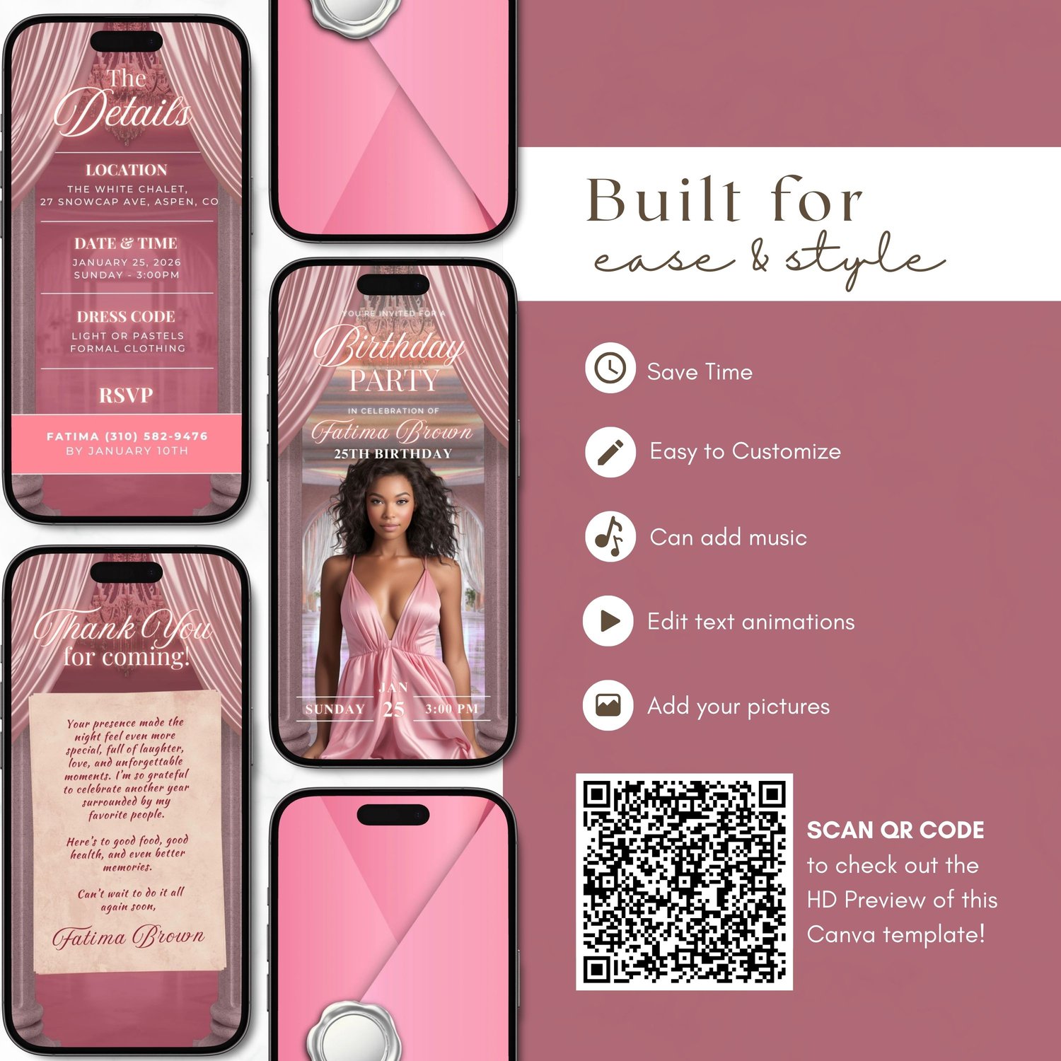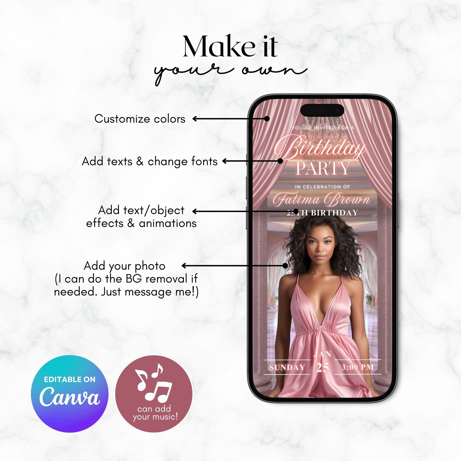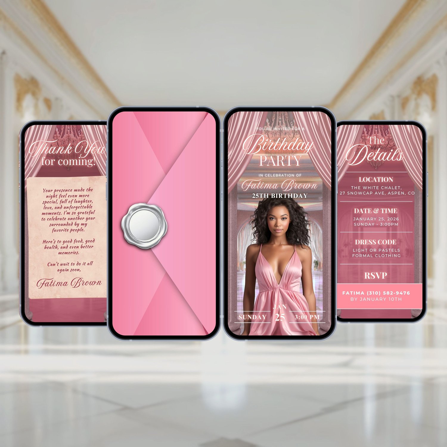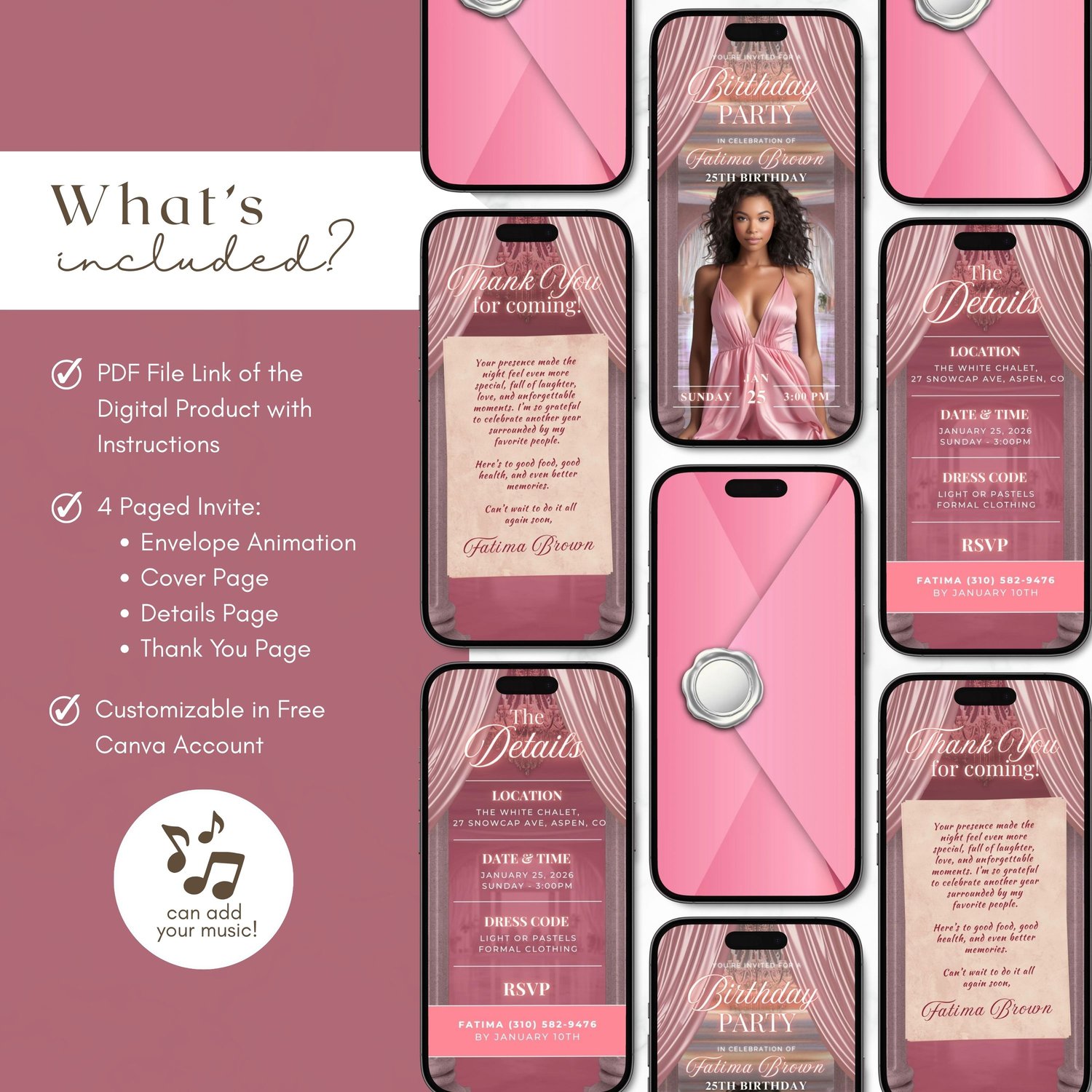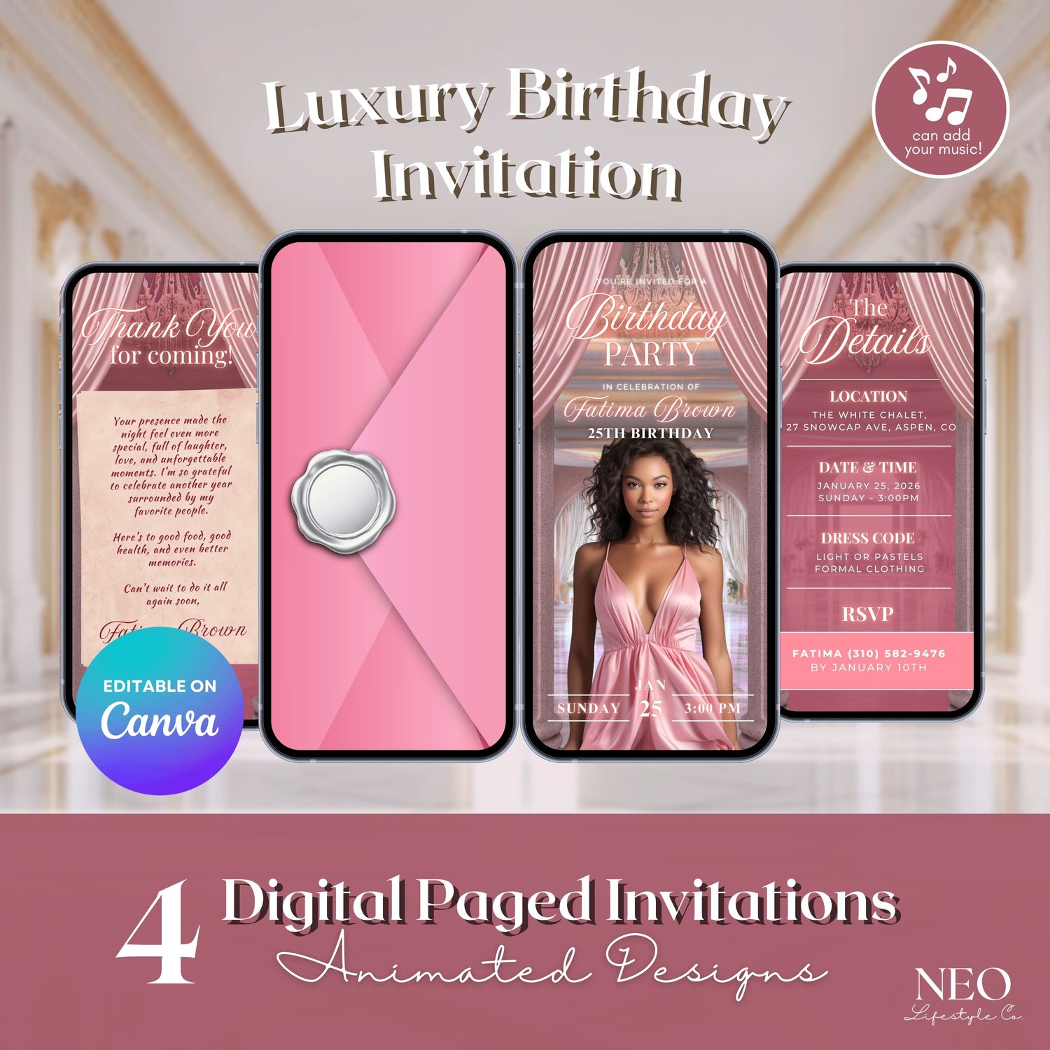 Luxury Birthday Invitation, Pink Birthday Party Invite for Elegant Women & Clean Girl (Aesthetic Animated Canva Template w/ Envelope)