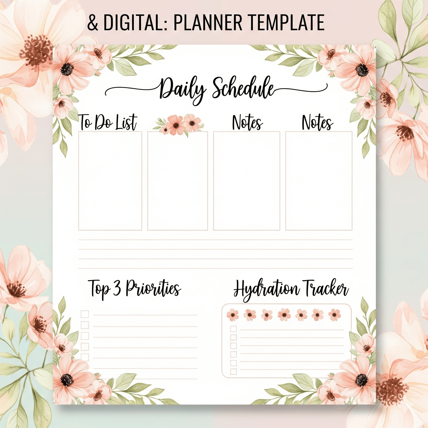 🌸 Elegant Floral Daily Schedule Planner – To-Do List, Priorities & Hydration Tracker 🌸
