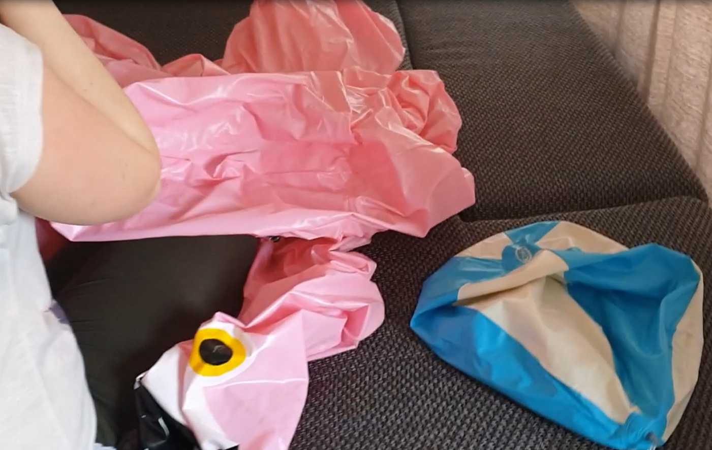 Video 53 - blowing, riding & deflating giant Flamingo & smaller beachball