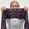 The neck warmer is knitted lengthwise, starting with a ridged triangle shape. Once the full width is reached, the pattern continues as a long thin rectangle, before decreasing to form a matching triangle at the other end. The neck warmer can be fastened with your favourite shawl pin or wrapped around the neck with the ends tucked in to keep you cosy!