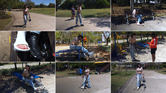The day was pleasant, with clear skies and a temperature of around 22 °C. Rebeca decided to take a walk in the park with crutches and cast heel. After a few minutes of walking, she stopped to do some exercises on the park’s equipment. When she finished, she asked someone to take a few photos of her. Finally, she continued her walk until she found a grassy, shaded spot where she could rest her leg.