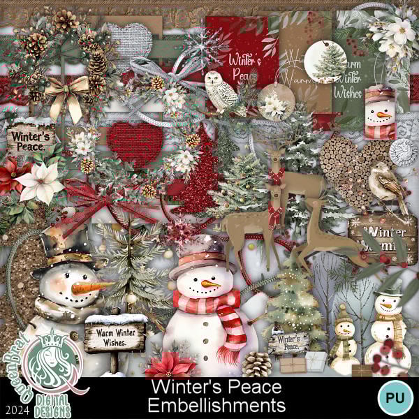 A serene, rustic woodsy Christmas kit in forest green and deep red with brown and white accents. Perfect for your outdoor play projects with the snowmen and deer already included. A must have kit for your Christmas collection.